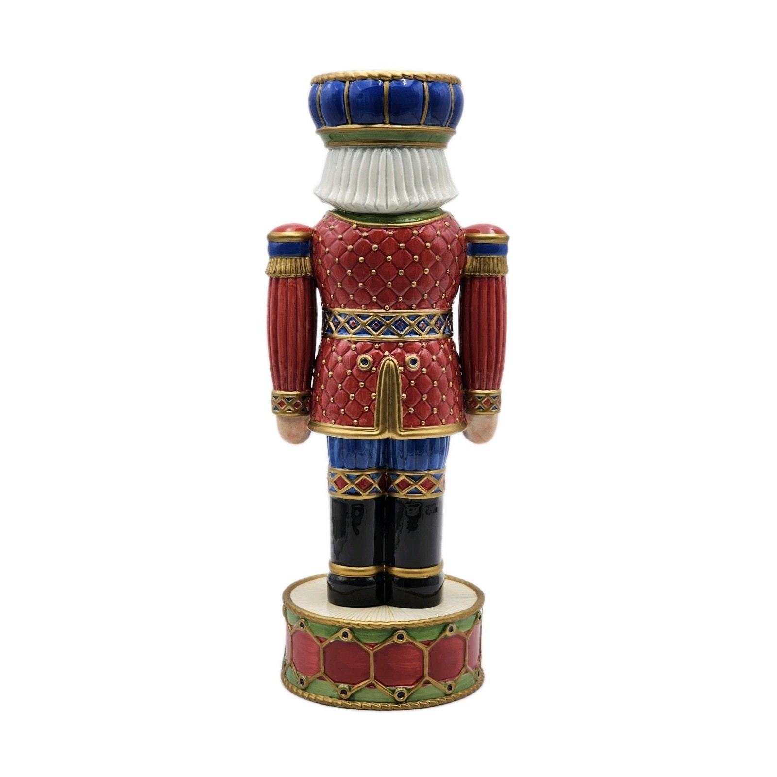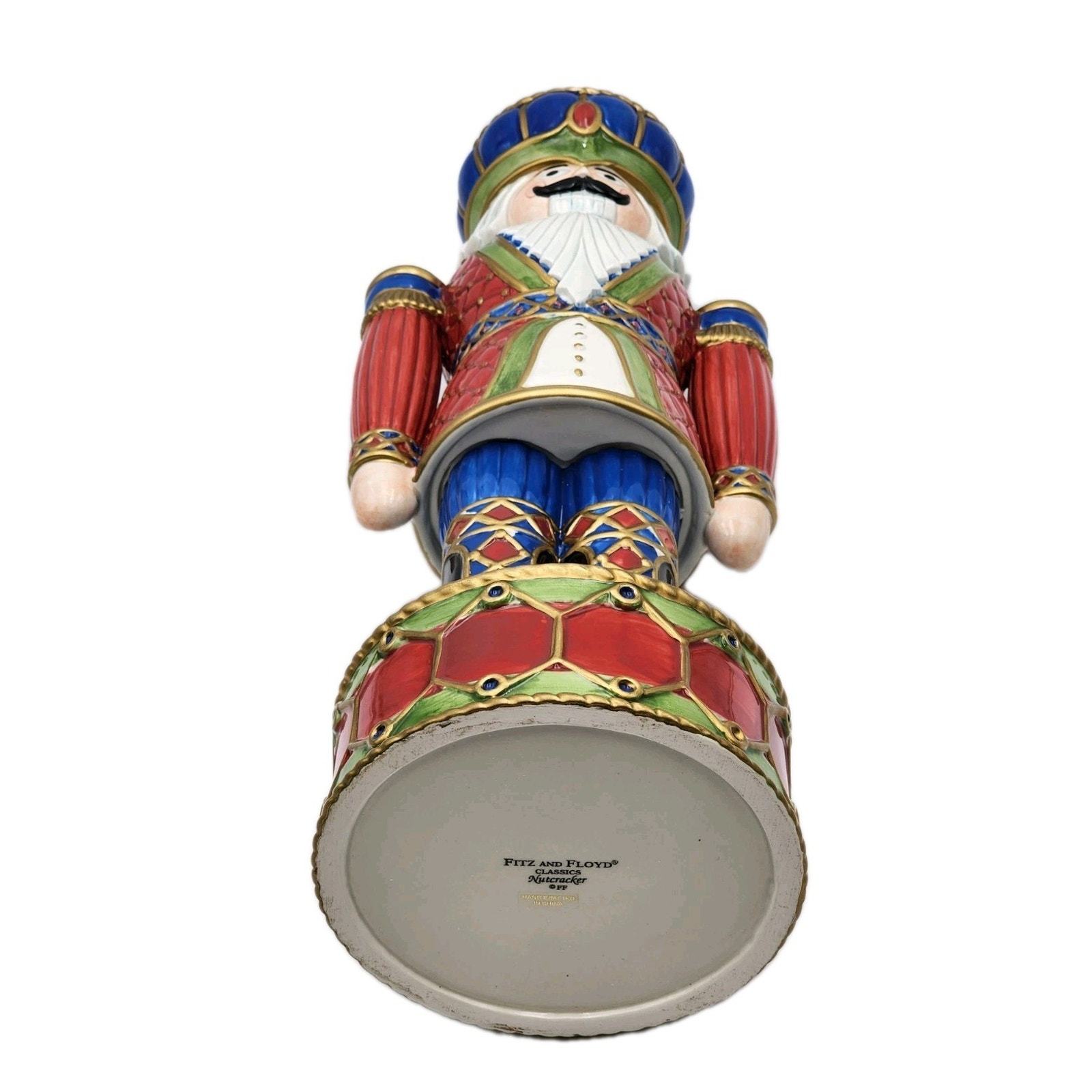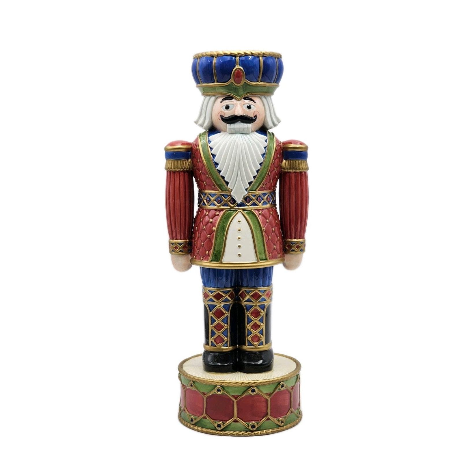 The Fitz and Floyd Nutcracker Large Candleholder is a vintage 2005 collectible that stands at 16 inches tall in its original box. It is a traditional, artist-designed piece of art pottery featuring a nutcracker shape, perfect for Christmas decor. This decorative ceramic and porcelain item from the Nutcracker Collection by Fitz and Floyd is a one-of-a-kind piece that adds a festive touch to any holiday display.