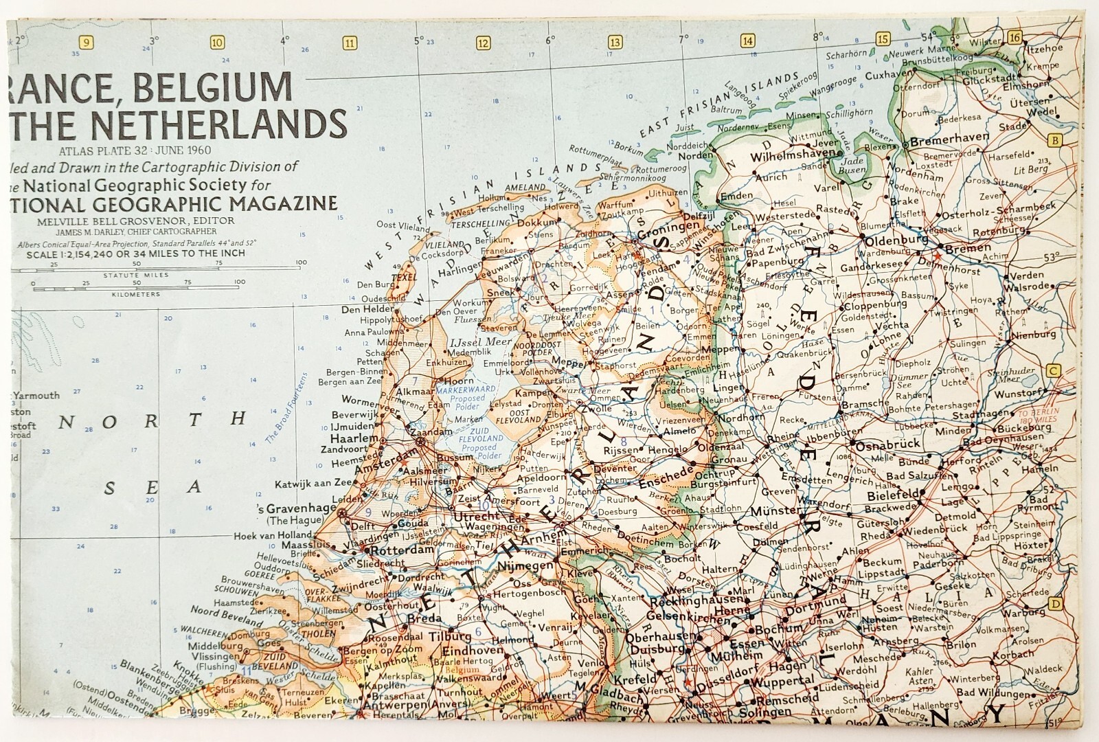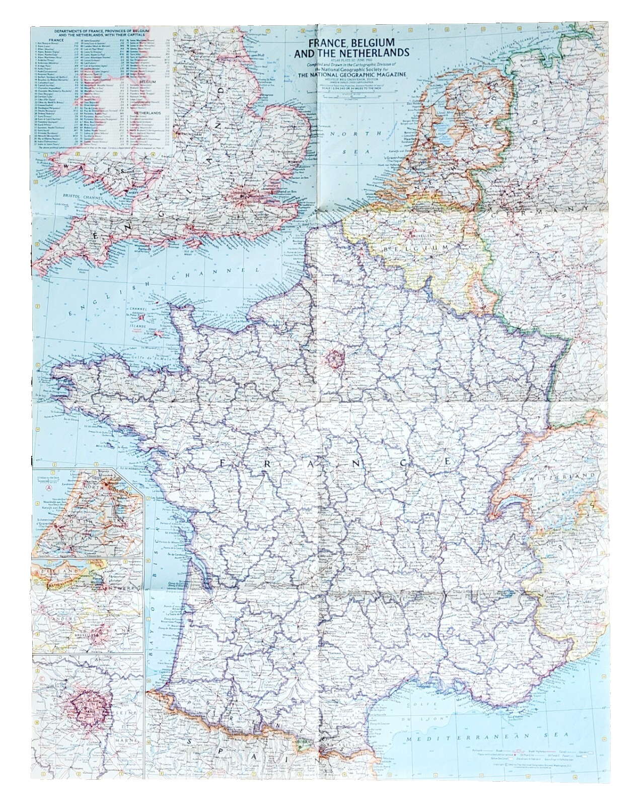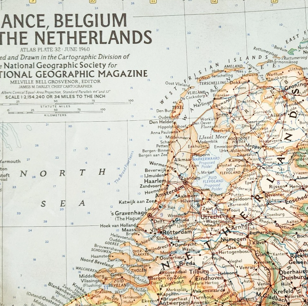 1960 France Belgium Netherlands Map National Geographic Vintage 24.75 x 19" F13F
