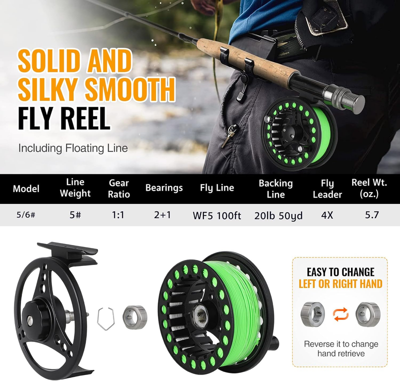 Smooth Fly Reel: Size 5/6 reel with sturdy aluminum spool, Teflon disk drag system, 1:1 gear ratio, and left/right hand switchable. Preloaded with 20lb backing, 100ft floating fly line, and 9ft leader.