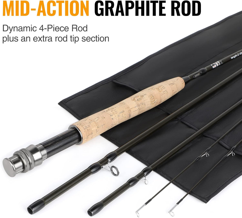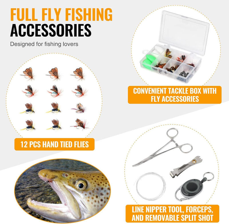 Complete Starter Package: Includes 4-piece carbon fiber fly rod, spare tip, pre-spooled fly reel, 12 flies in tackle box, line nipper, forceps, zinger, and carry bag.