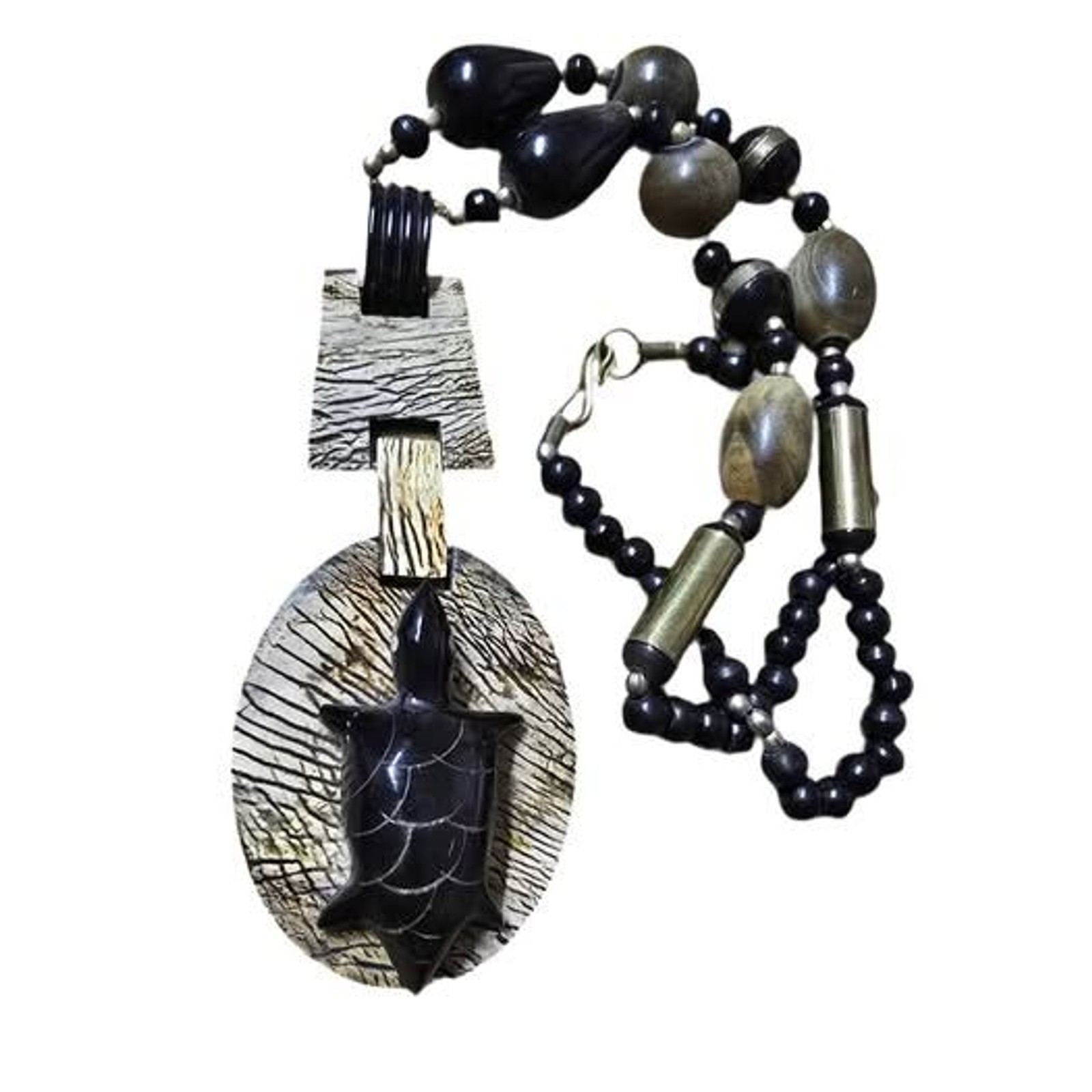 This unique necklace features a bold carved turtle pendant set against a textured oval and geometric base with earthy, nature-inspired detailing. The turtle, a universal symbol of wisdom, protection, and longevity, adds both beauty and meaning to the piece. The strand is adorned with a mix of black teardrop beads, round spacers, and earthy accents, creating a striking tribal-inspired design.
