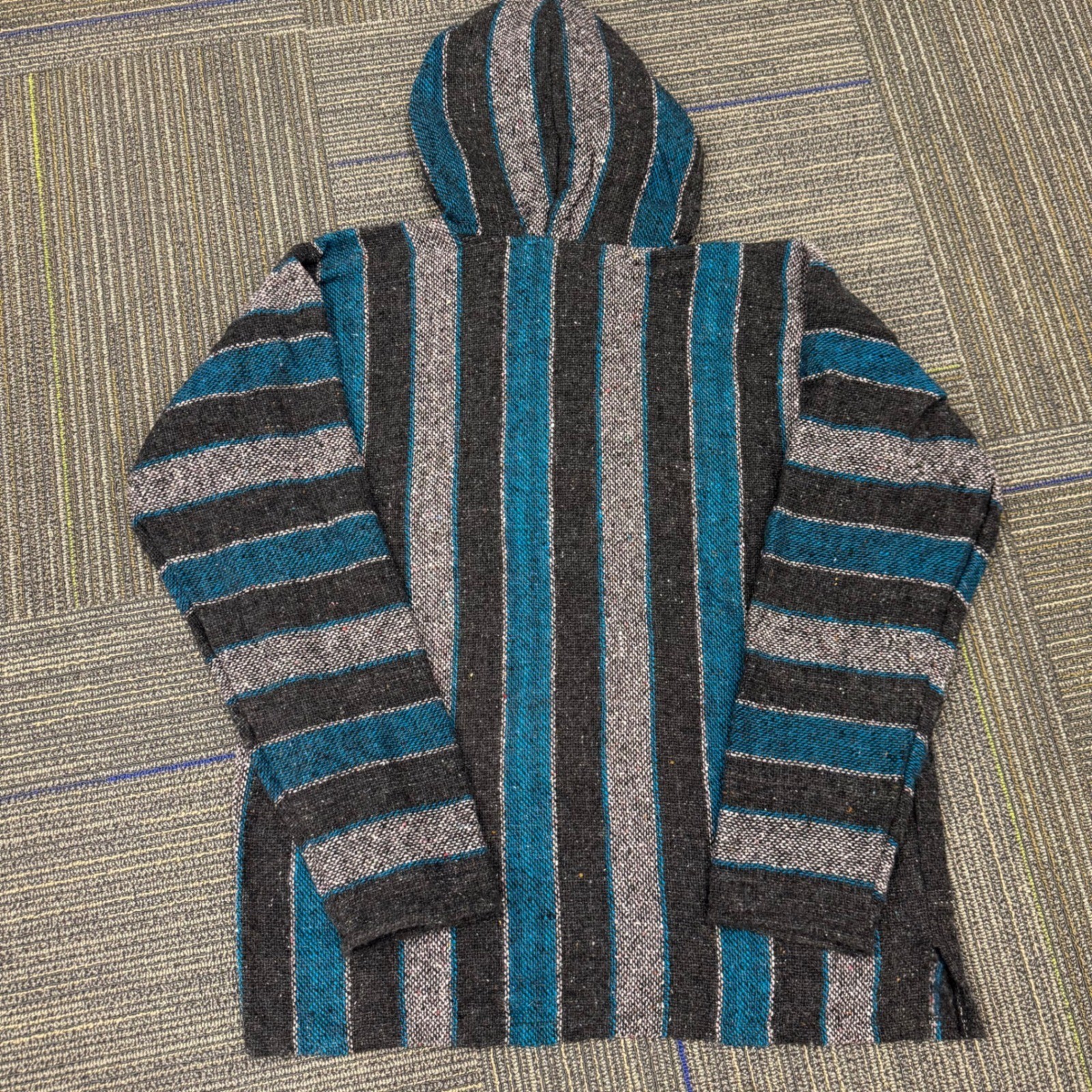 Keywords: baja hoodie, drug rug, poncho, striped hoodie, mens hoodie, yarima, xl hoodie, pullover hoodie, boho hoodie, festival hoodie, gray hoodie, blue hoodie, eco yarn, ecuador, handmade