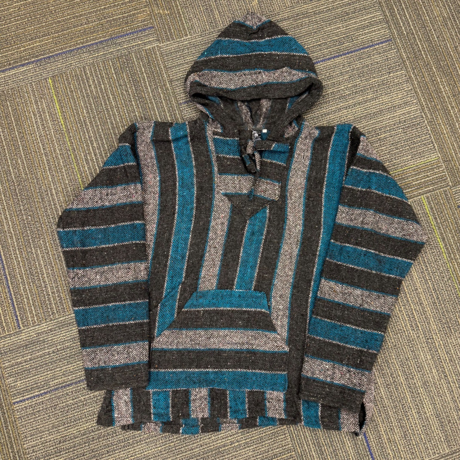 Yarima XL Baja Hoodie Pullover Gray Blue Striped Drug Rug Poncho Mens