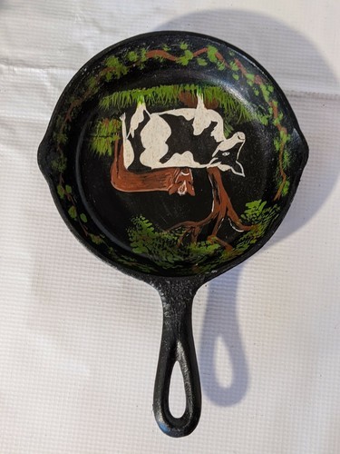 Up for sale is a used No. 3 Cast Iron Skillet with Molders Mark Y and 3 Notch Heat Ring that measures 6 inches in diameter. Some one used the skillet as a decorative piece by adding a cow seen on the inside.