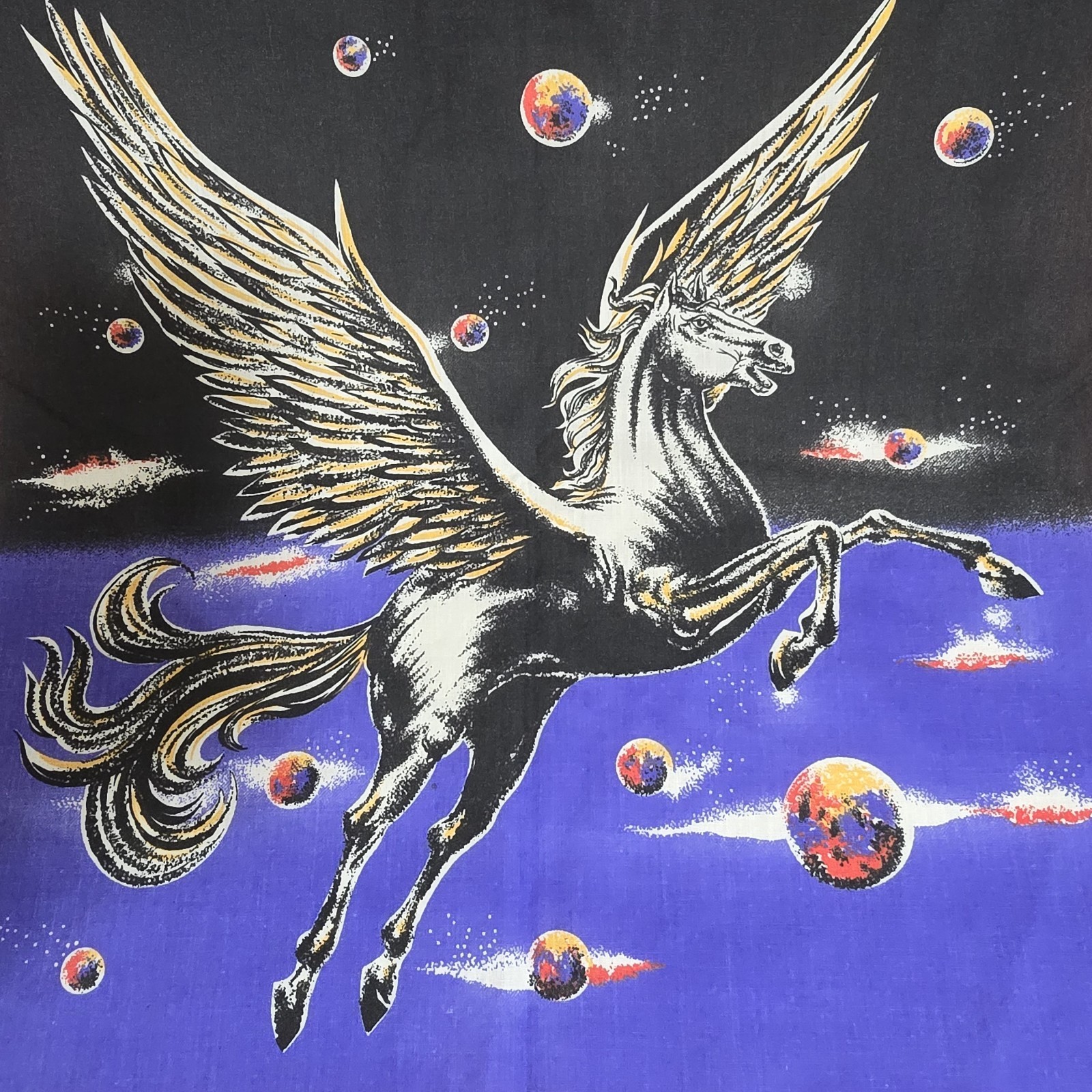 Vintage 1980s Pegasus Flying Winged Horse in Space 22x21 Bandana - Made in USA