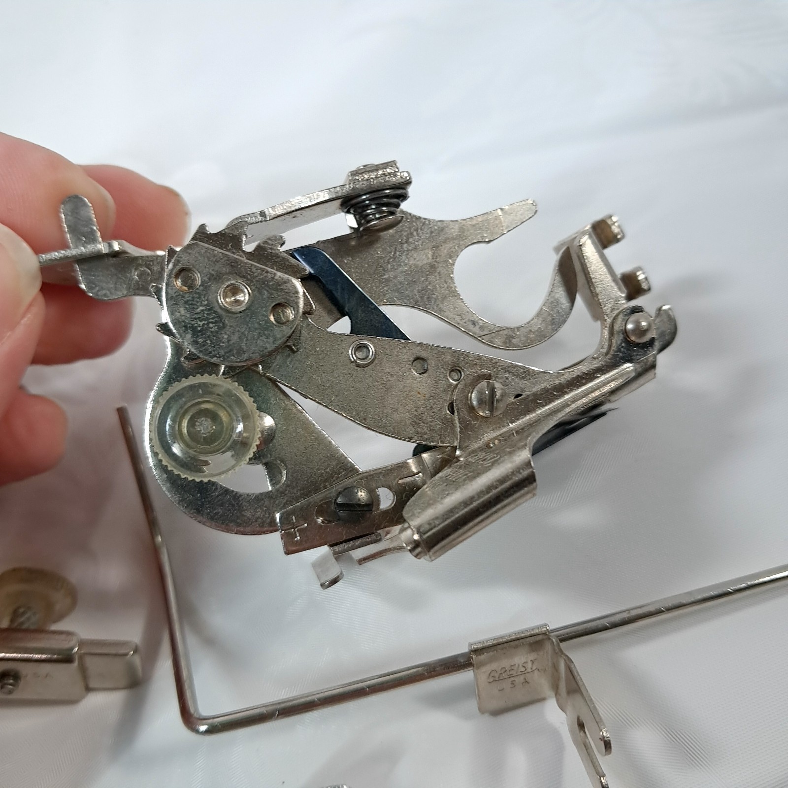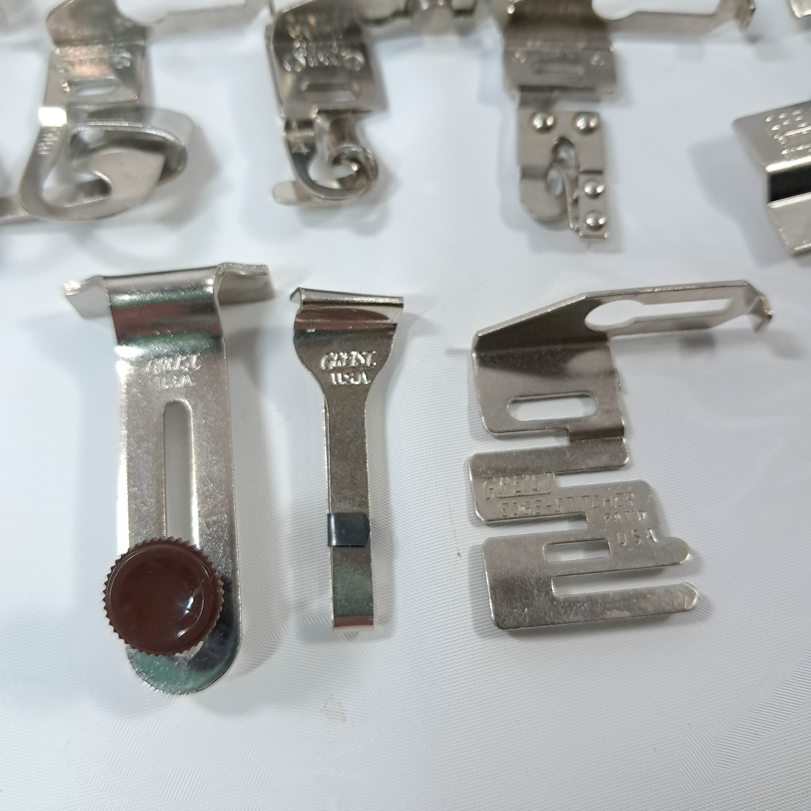Vintage Greist set 12 sewing machine foot attachment hemmer edge guide ruffler