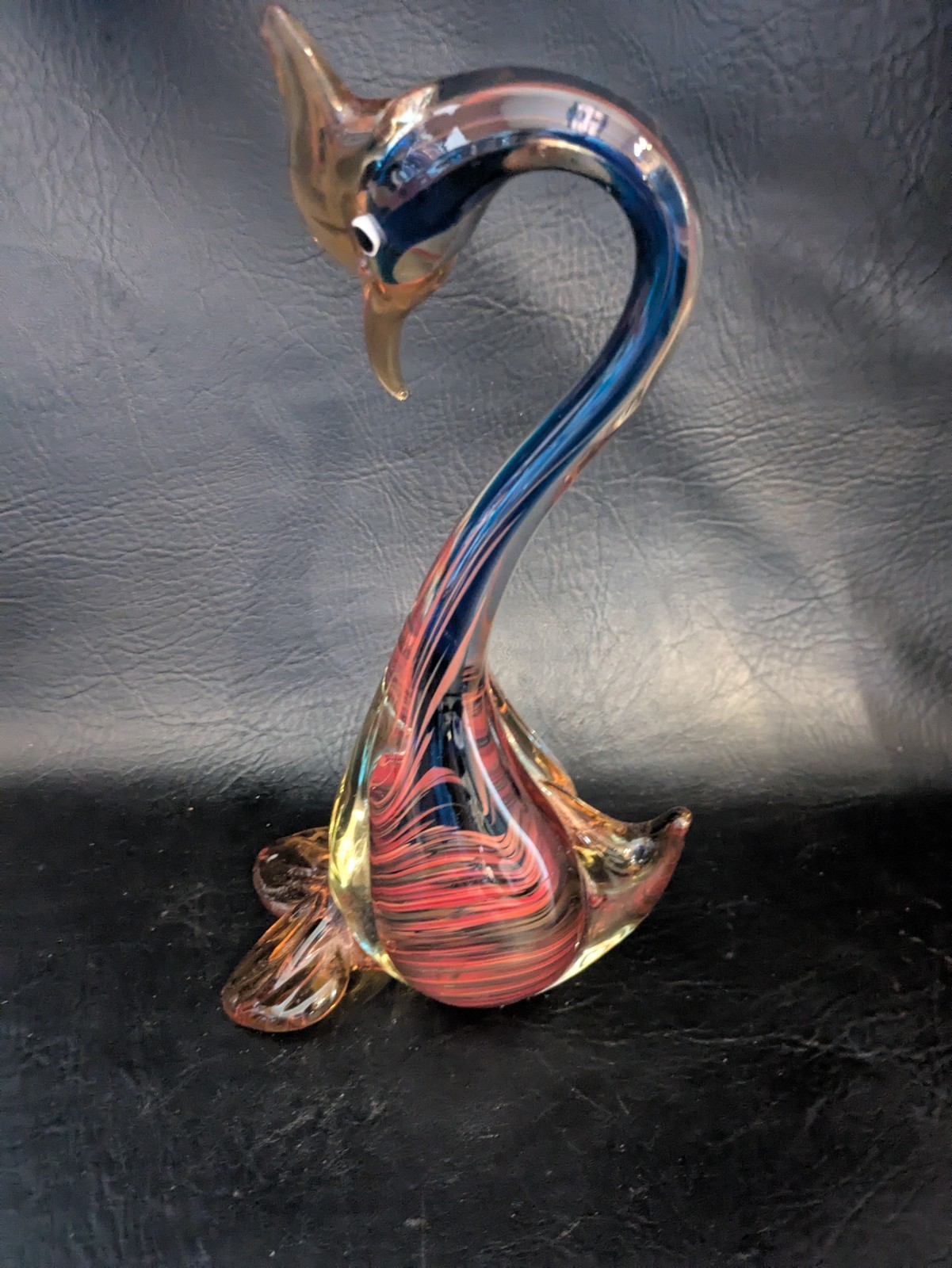 Cette statue en verre d'art murano venitien de 11 pouces de cygne de 11 pouces en couleurs rouge, bleu et jaune est une figurine magnifiquement fabriquee a la main qui degage l'elegance et le style. Fabrique en Italie en utilisant la technique de production de verre d'art du verre souffle a la main, cette piece decorative presente un motif d'illusion avec une finition brillante. Parfait pour les collectionneurs de poterie et de verrerie uniques et vintage, cette statue de cygne est un ajout hors concours a toute decoration interieure.