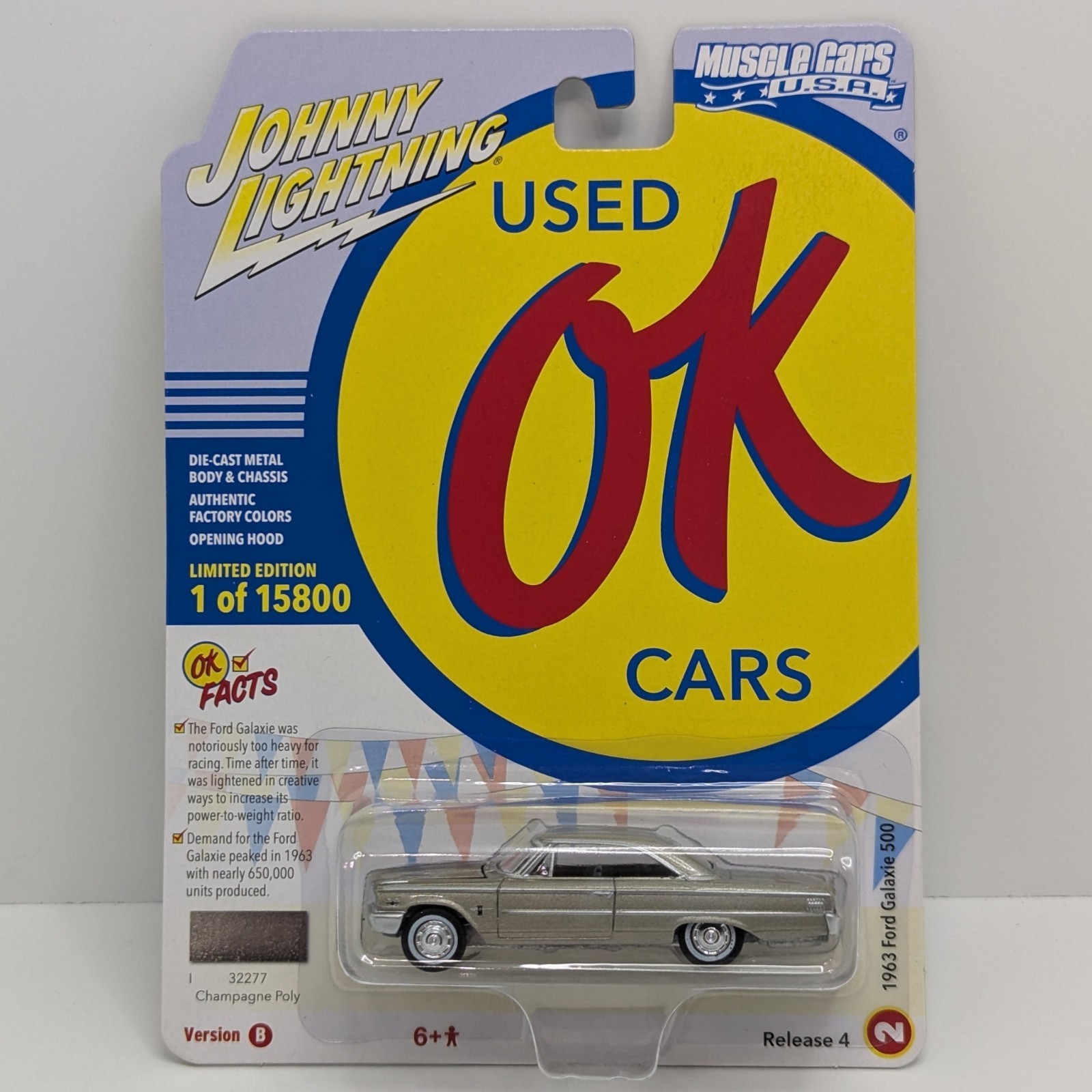 Johnny Lightning OK Used Cars Series 1:64 diecast featuring the 1963 Ford Galaxie 500 in Champagne Poly. This classic full-size Ford muscle car showcases authentic details and nostalgic styling that collectors value.
