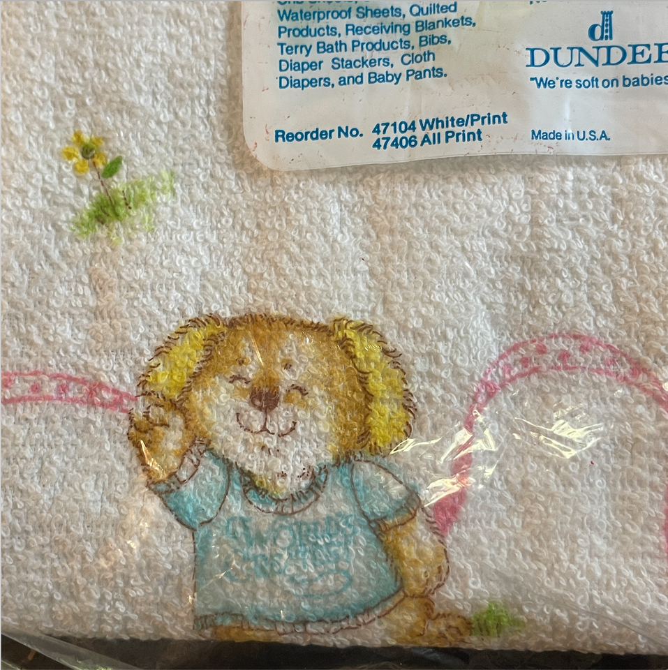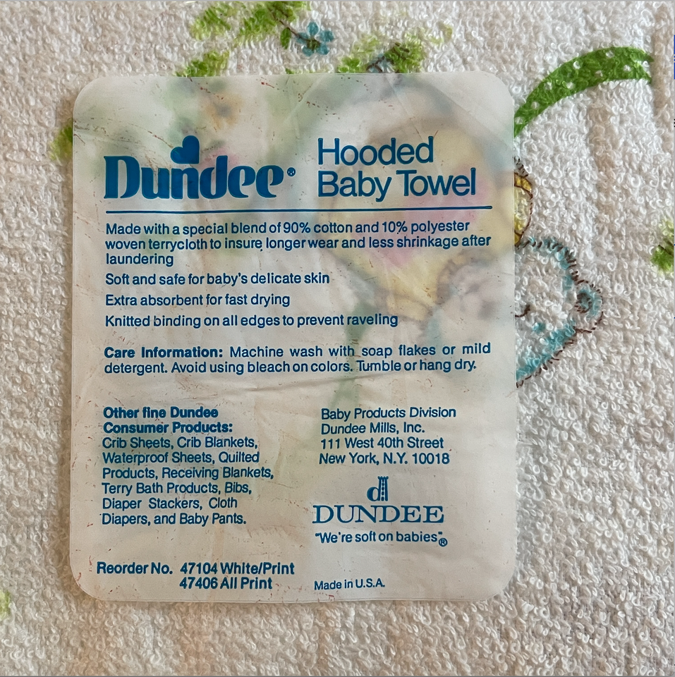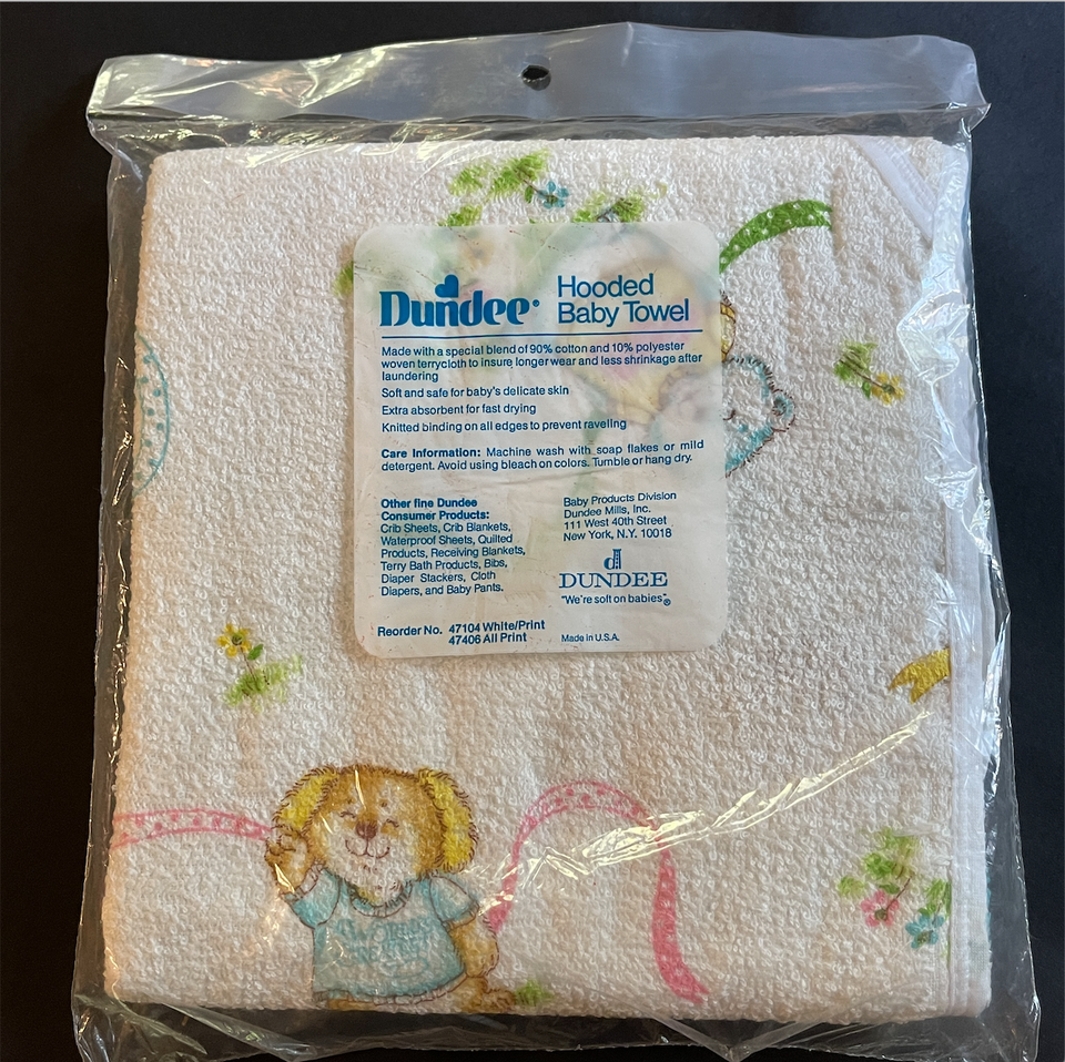 Vintage new old stock in package Dundee hooded baby bath towel. Measures 30 x 36. Made in USA of 90% cotton 10% polyester blend woven terrycloth. Super cute bear and floral pattern. Has original Jamesway price tag sticker on package. Please see all photos. We are a smoke free, pet friendly home. Have a great safe day!