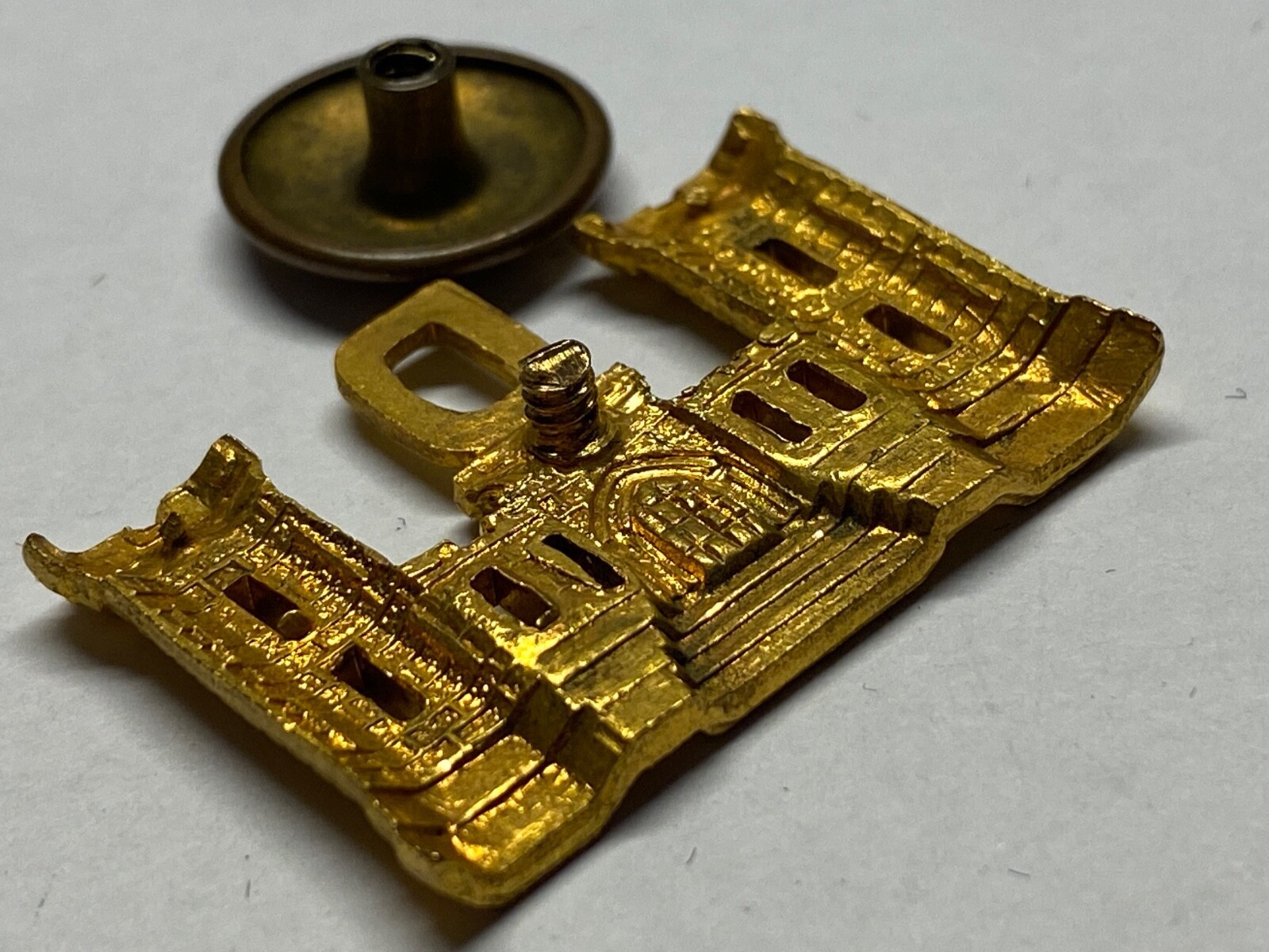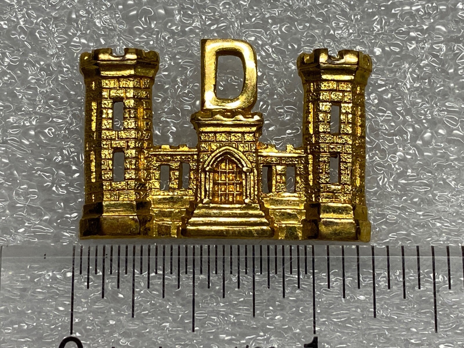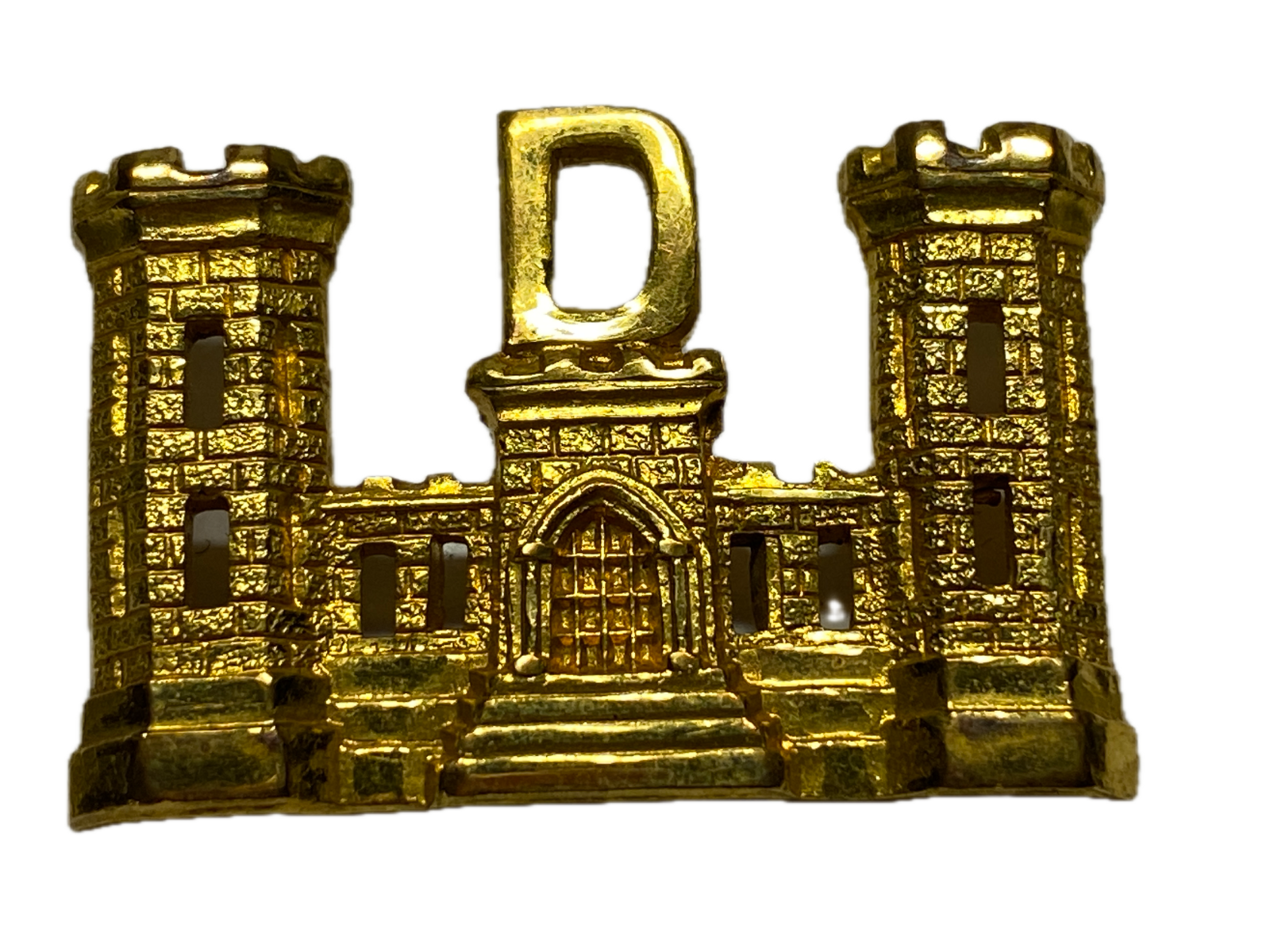 From 1905-1918, Corps of Engineers soldiers wore this size of cap insignia. This gilt color was worn on dress caps. the company letter indicates it was used by a company member between1905, when smaller castles were introduced, and 1916, when regiments were formed.