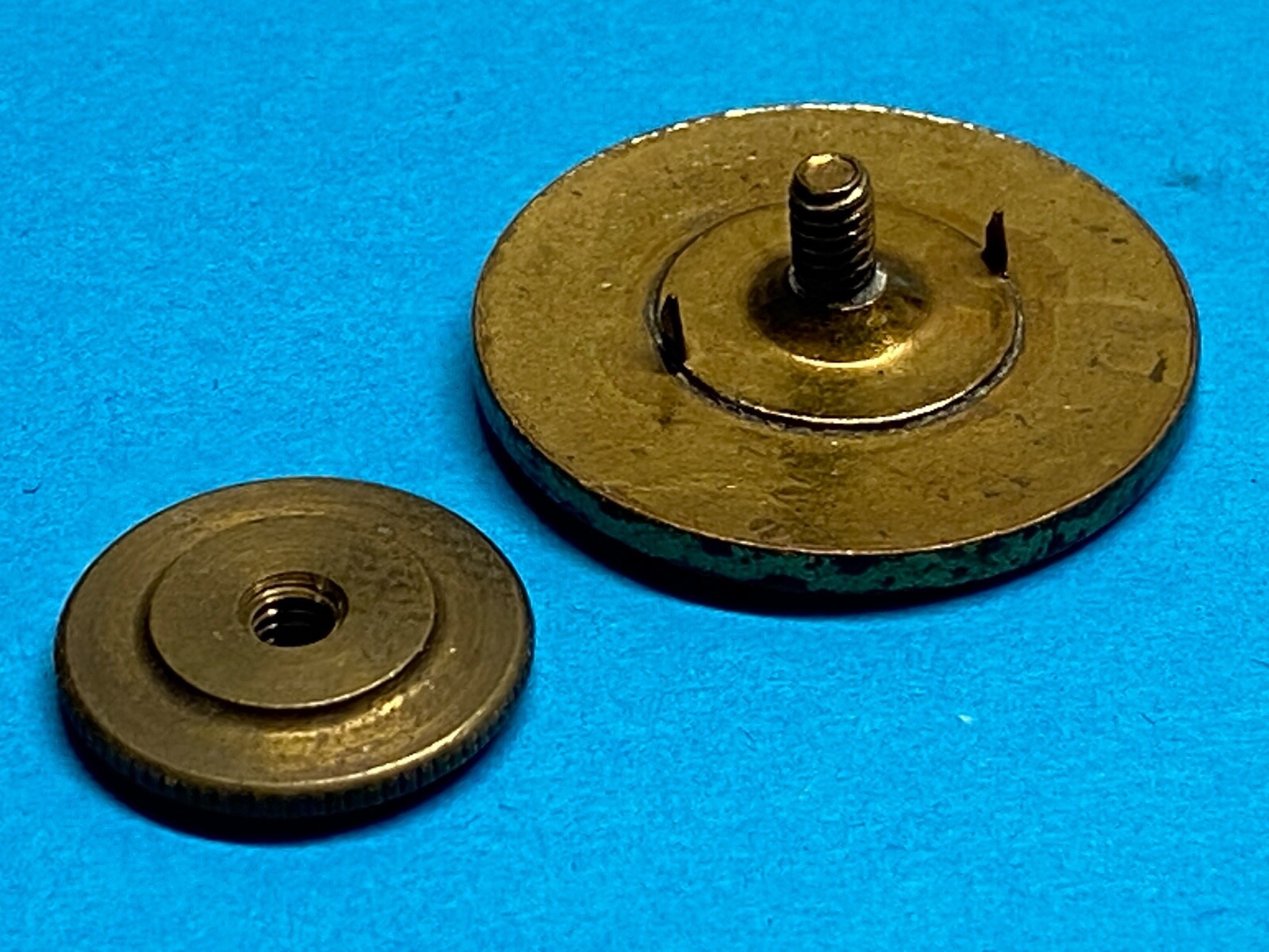 The original concept of the bronze collar disks was that they would be worn on the service uniform as distinct from the blue dress uniform. In 1917 with the nation at war the dress uniform and its insignia were suspended. It was to be an olive drab and khaki war. Once the war ended the dress blue uniform was not restored for general use but for many the service uniform was too drab. The solution was to use gilt collar disks rather than bronze ones. Previously, gilt disks had been approved in situations where troops were wearing white dress uniforms and certain other situations. Army Regulations AR 600-35 of October 14, 1921 stated that collar disks might be bronze on service uniforms and gilt on white uniforms. On November 25, 1924 the bronze disks were dropped for peace time use on all uniforms. Those still in service were to have been polished to a bright finish.
