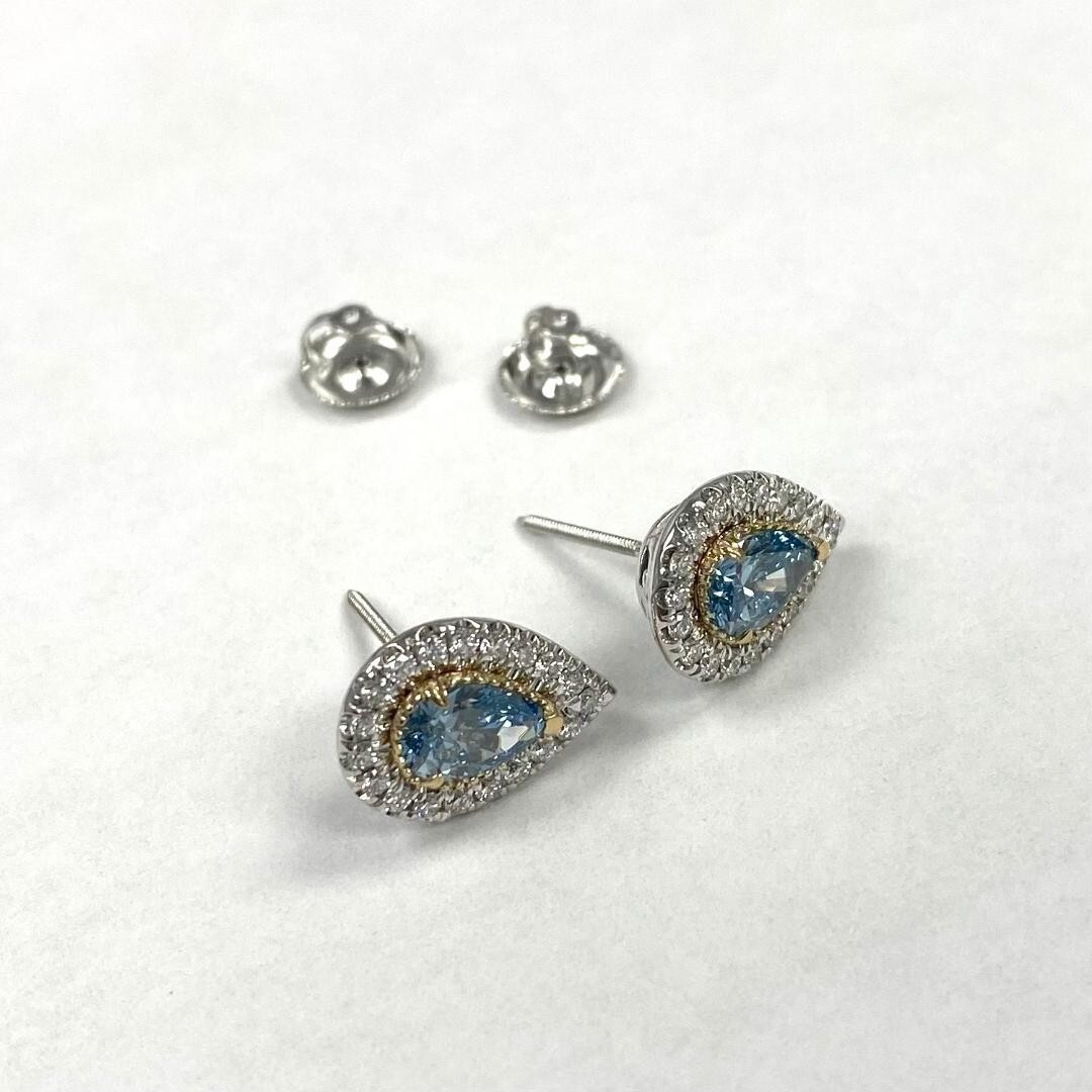 Classic earrings features a central pear brilliant cut lab grown blue diamond surrounded by smaller diamonds in a halo design, all set in 14k white gold with screw back closures for security. The "round brilliant cut" is a specific style of cutting a diamond that maximizes its Sparkle and brilliance. Halo Diamonds: These are smaller diamonds surrounding the center diamond, forming a halo-like effect. Screw back closures feature a threaded post that screws into a threaded backing, providing a secure fit. 14k white gold is a It's a popular choice for jewelry due to its durability and classic appearance. Our products are all hand made with quality and care, in the heart of the diamond district on 47th Street in New York City. Our dedication and commitment to fine work and quality exceeds all