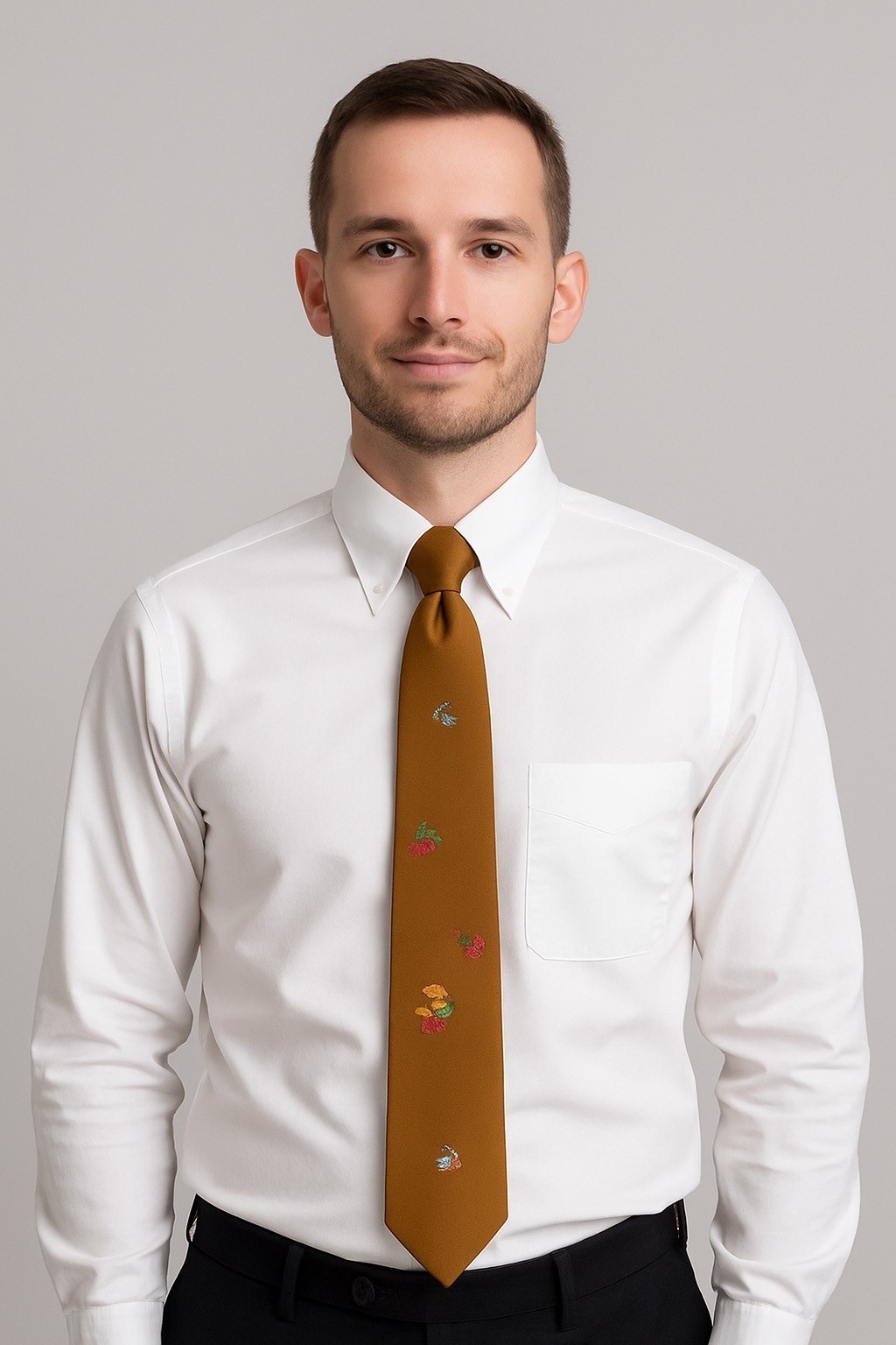 Add a touch of retro charm with this Johnny Miller men?s necktie featuring embroidered clusters of blue flowers, red berries, and a small golden bird on a rich brown background. A standout piece for both work and casual wear.