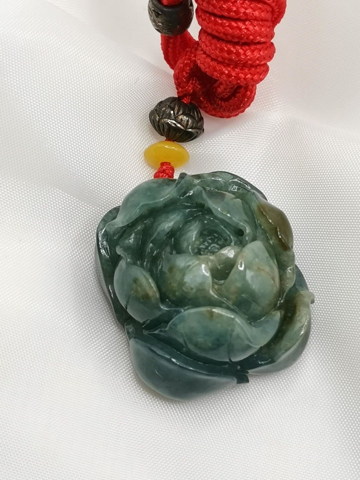 Fine Hand Carving Ice Green 100% Natural Burma Jadeite Jade Peony Flower Pendant for Beauty and Harmony