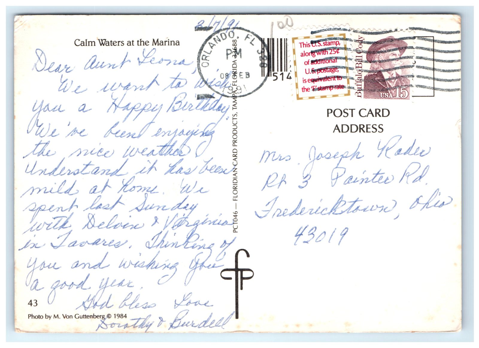 Produced by Floridian Card Products, Tampa, Florida, this original lithograph postcard is a continental size (6 x 4 inches) and features chrome finish for vibrant color and durability. The back side of the postcard includes a handwritten birthday message dated February 7, 1991, and is postmarked from Orlando, Florida. The stamp features Buffalo Bill Cody and indicates authentic U.S. postal use, enhancing its appeal for postcard collectors. A perfect addition to any collection focused on Florida, maritime scenes, or vintage photography.