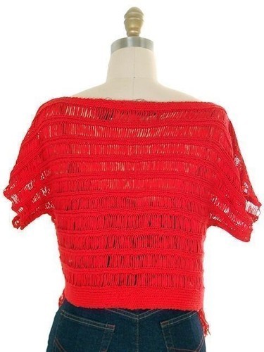 Totally 1980s Organically Grown sweater top, knit in a single-piece construction from a ramie/polyester blend. Features a fringed hem at the high waist, wide shoulders, and cropped silhouette. Casual throw-on piece with strong retro vibes ? you can just picture Jennifer Grey in ?Dirty Dancing? tossing it over her catsuit.