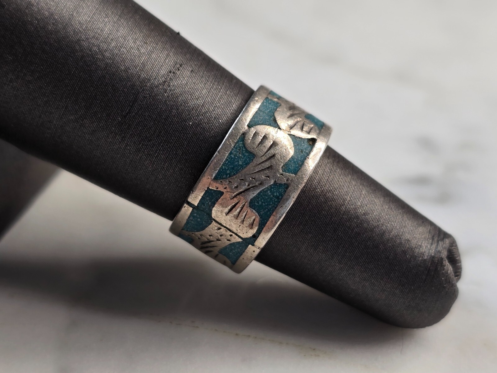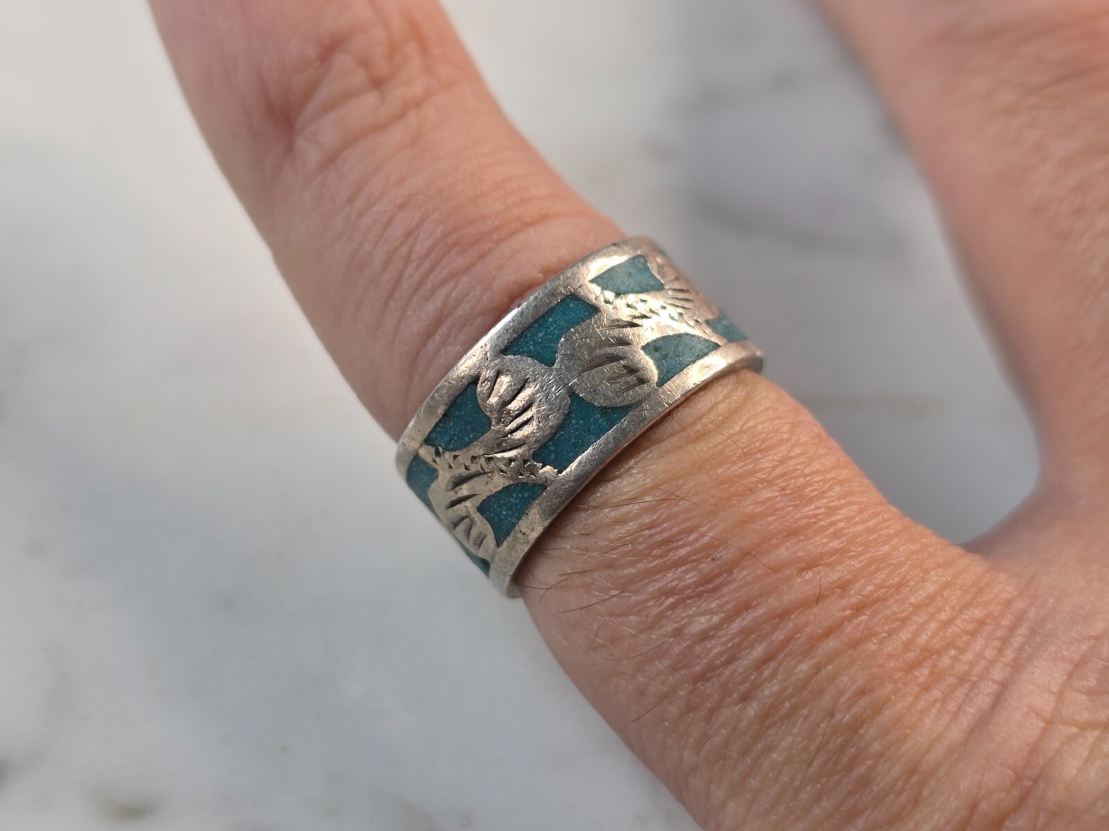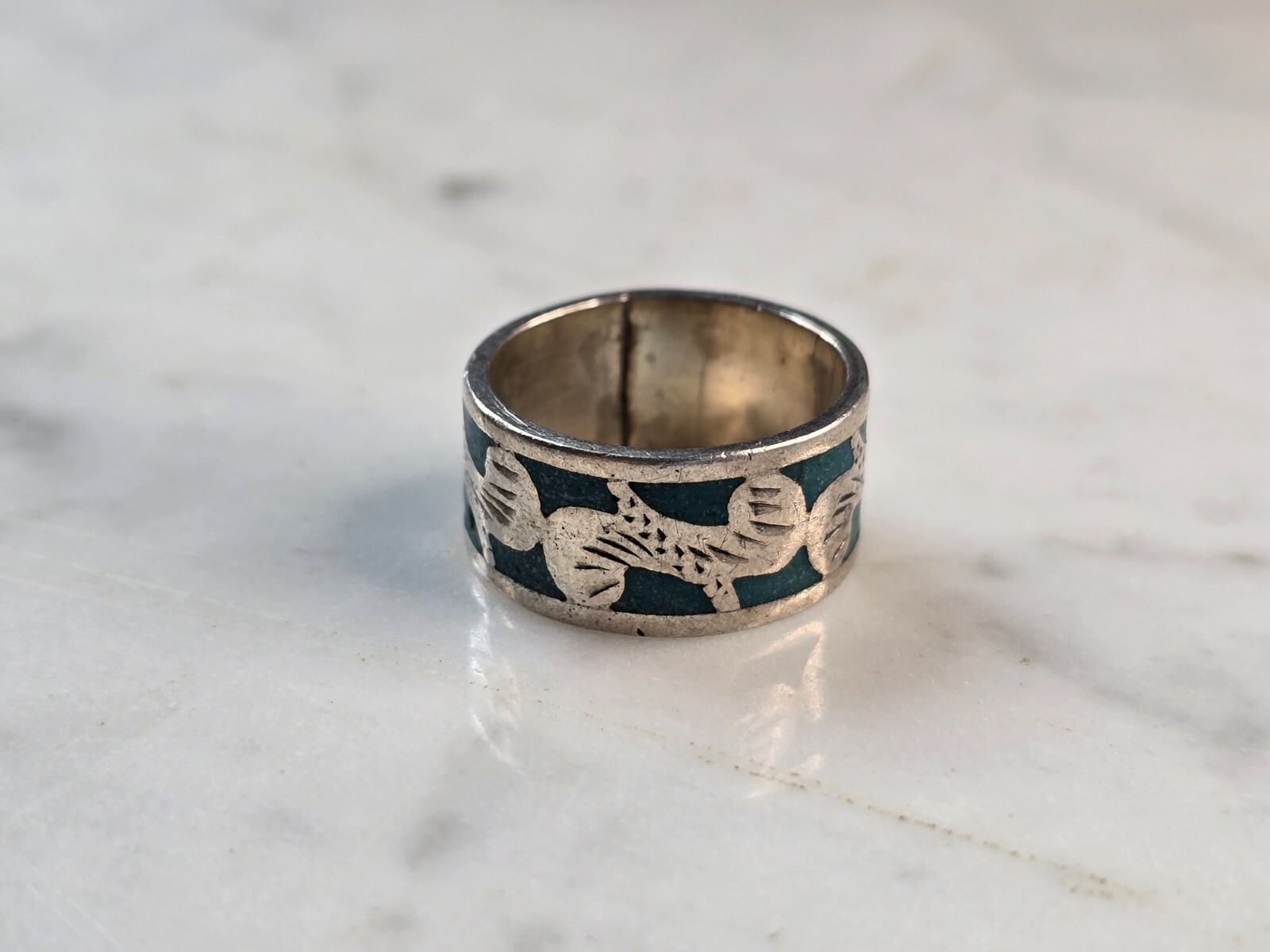 A WOMENS VINTAGE ESTATE STERLING SILVER ENAMEL RING. THE RING SIZE IS A 5.75, AND WEIGHS 5.2g. THE WIDTH OF THE RING IS 3/8". WOULD MAKE A NICE GIFT FOR THAT SOMEONE SPECIAL. ANY QUESTIONS PLEASE DO NOT HESITATE TO ASK. BE SURE TO CHECK OUT SOME OF MY OTHER GREAT ITEMS UP FOR SALE. THANK YOU.