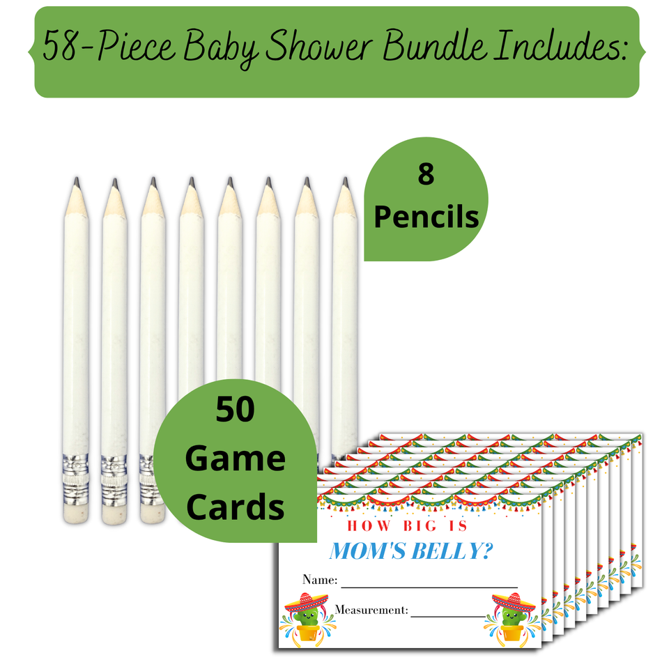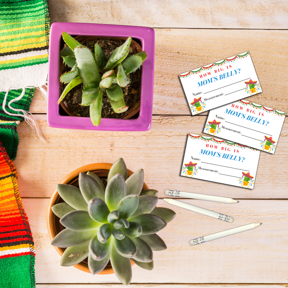 Holy Guacamole Baby Shower Fiesta: Measure mom's belly baby shower game matches cactus baby shower decorations, fiesta baby shower games, baby advice cards, gender reveal cards, and baby shower advice cards for parents to be. Design matches baby shower cactus themed parties. How big is the baby bump shower belly game works well for boy baby showers or girl baby shower. Guessing Game For Baby Shower: Coed Baby Shower Game Bundle is the perfect addition to your cactus themed baby fiesta!