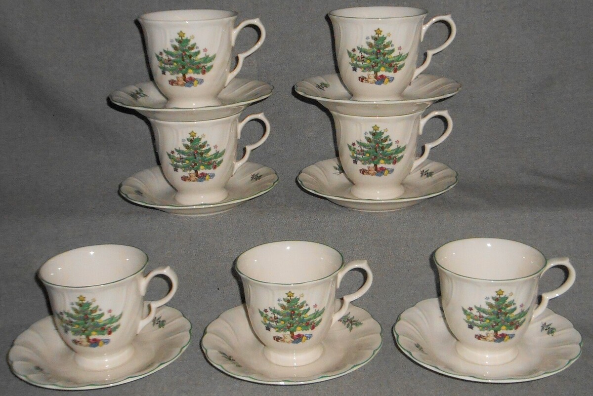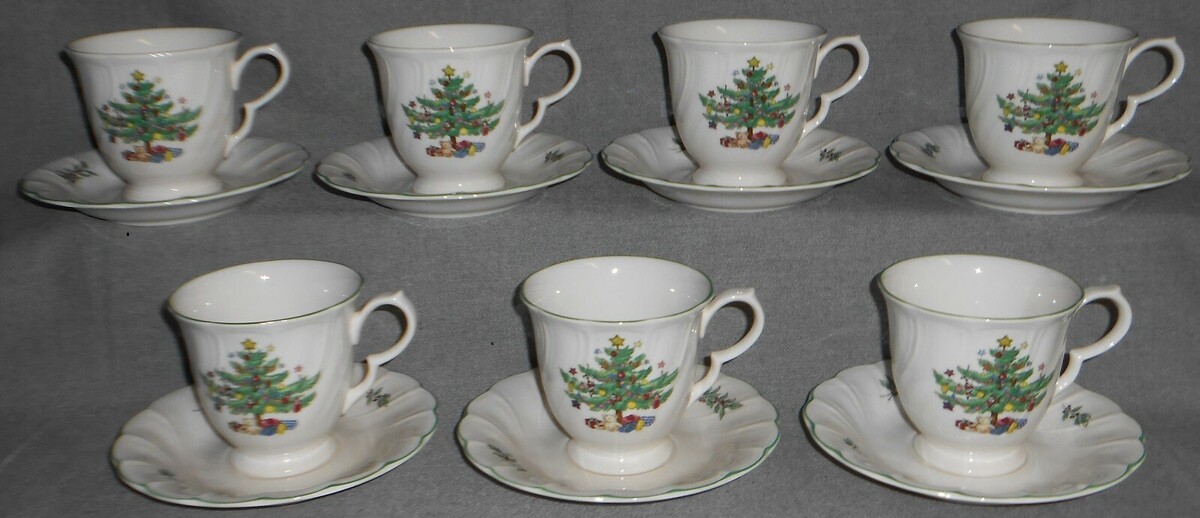 This is a Set of (7) 6" Saucers and (7) 3 1/4" Tall Cups from Nikko in the Happy Holidays Pattern. They are in great pre-owned condition with no chips or damage.