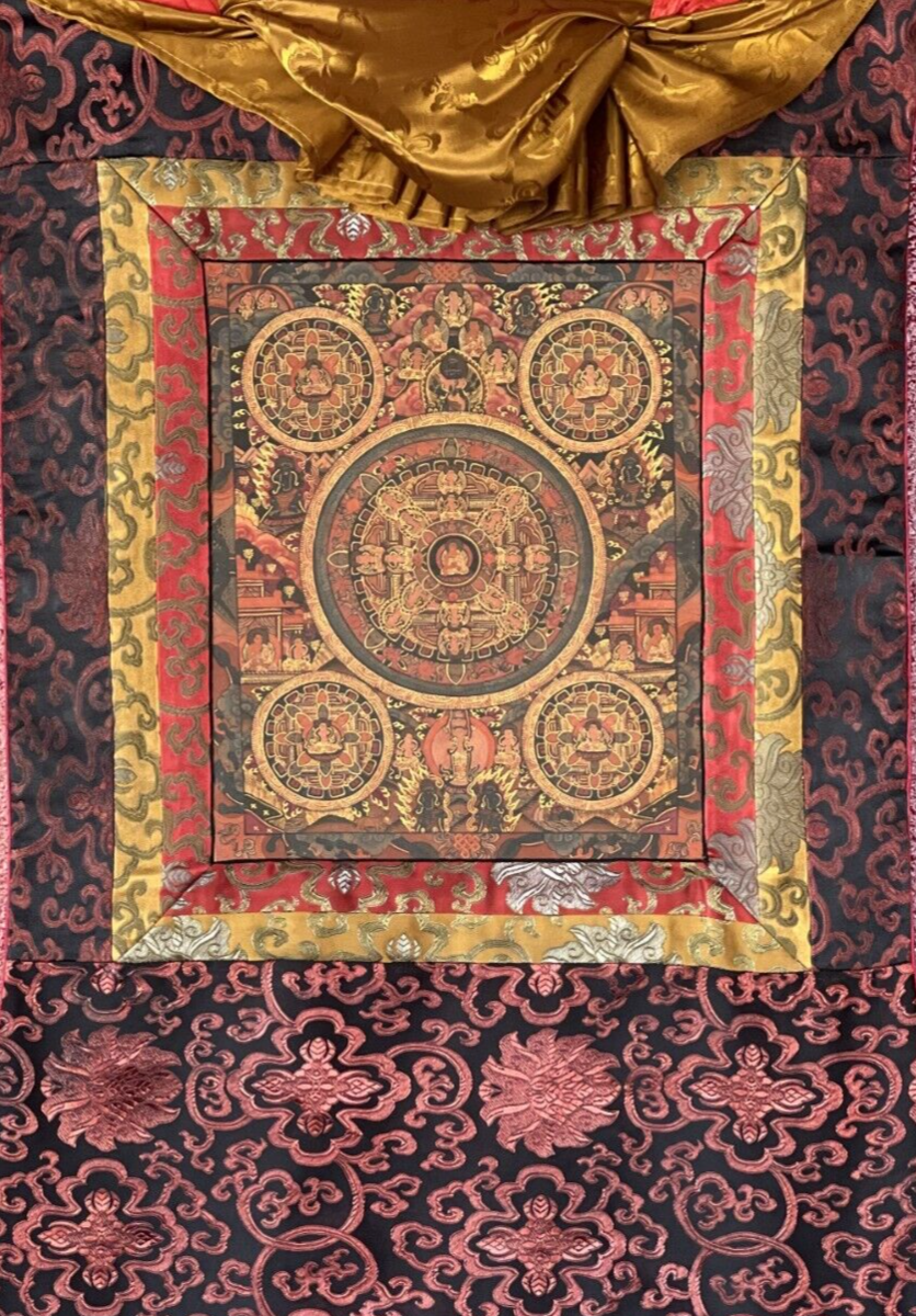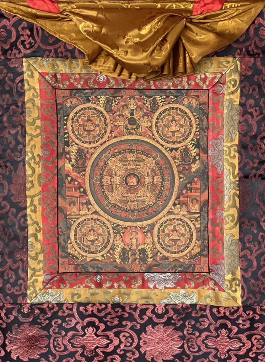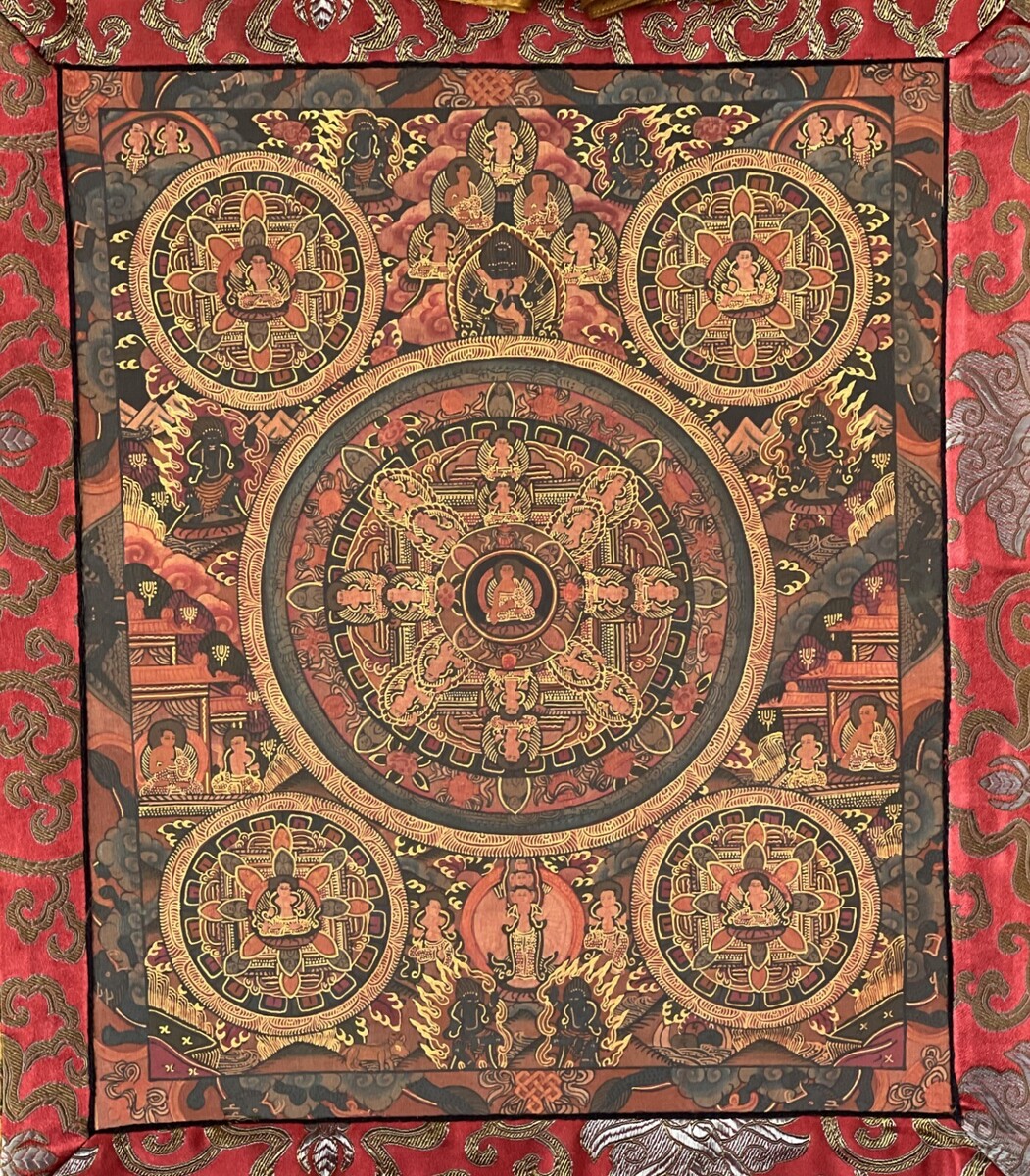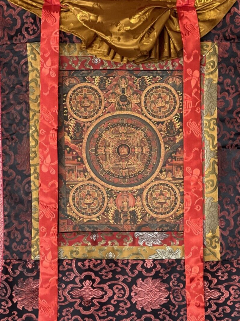 HAND-PAINTED BUDHHA LIFE MANDALA TIBETAN THANGKA PAINTING WITH SILK BROCADE