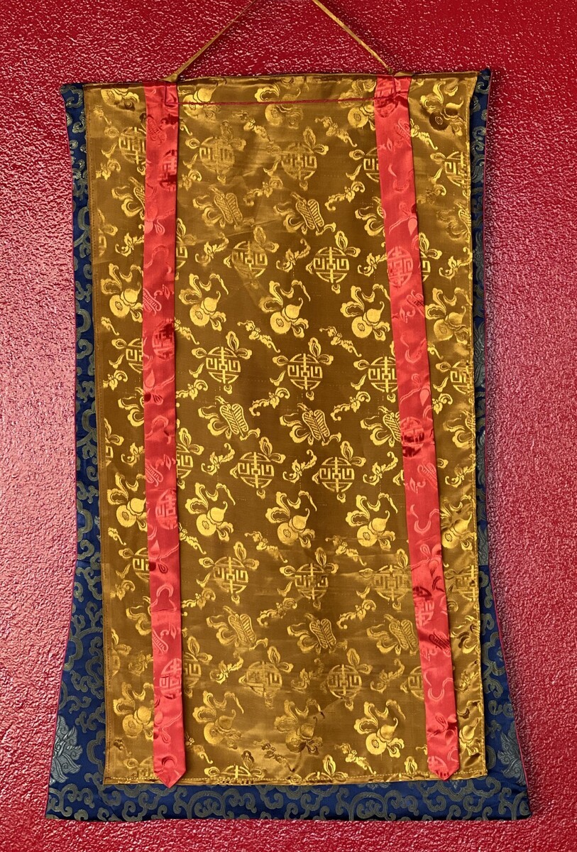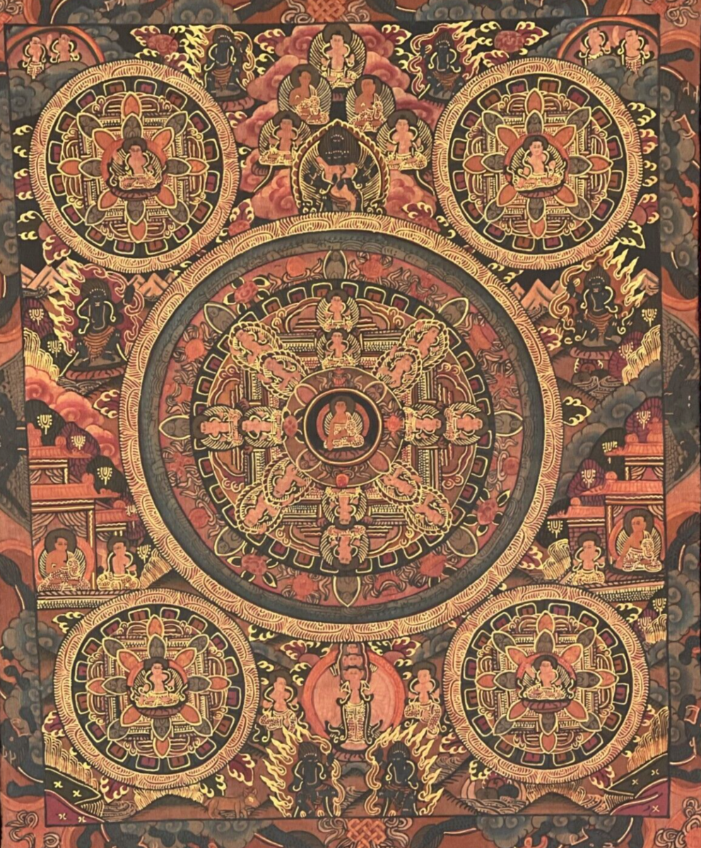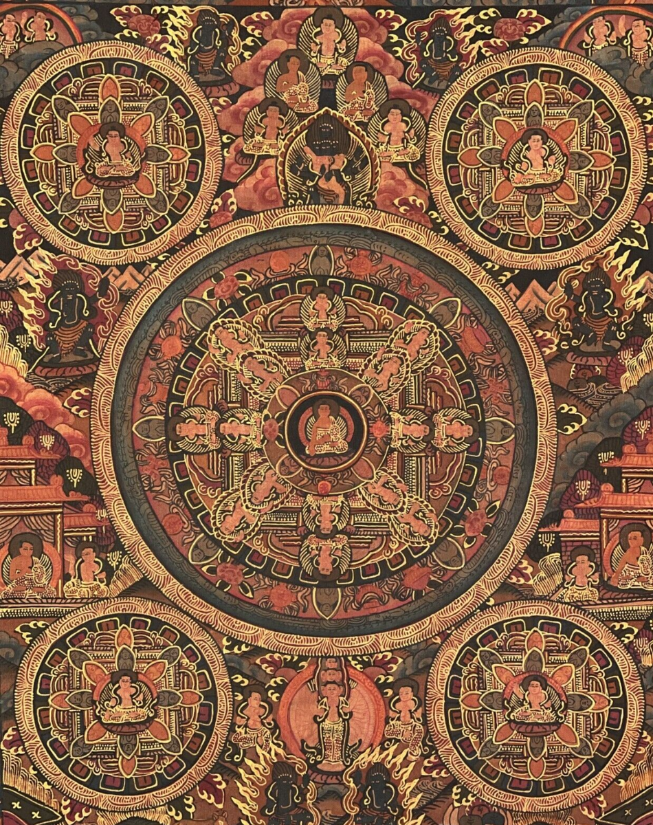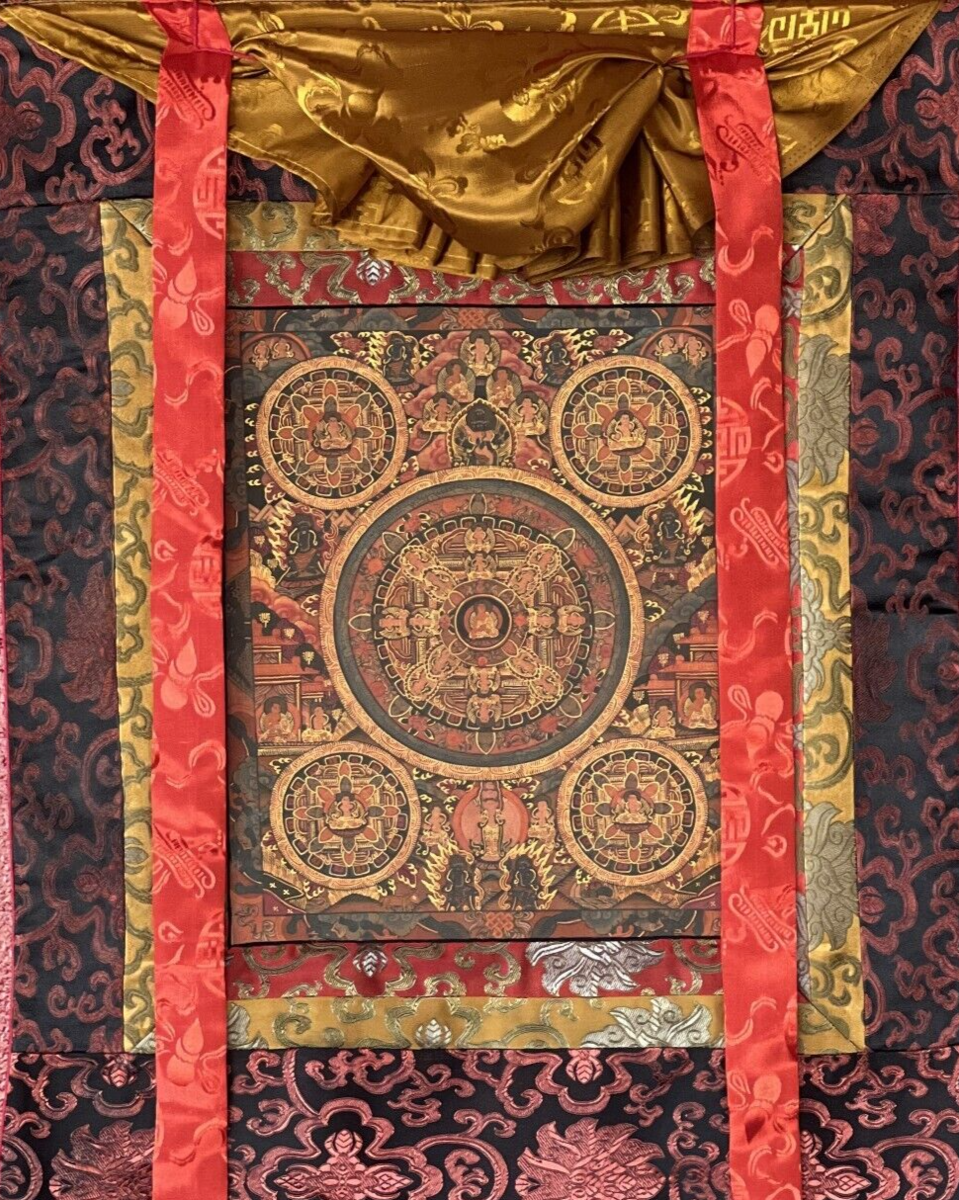 HAND-PAINTED BUDHHA LIFE MANDALA TIBETAN THANGKA PAINTING WITH SILK BROCADE