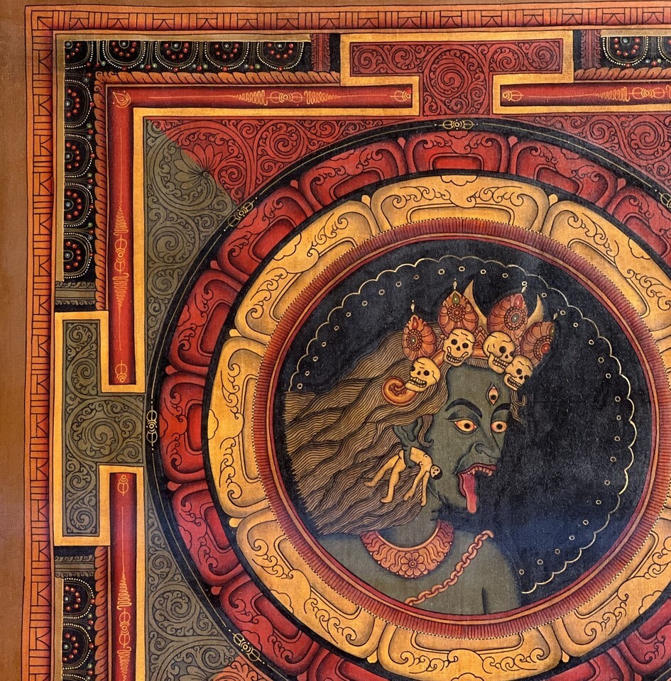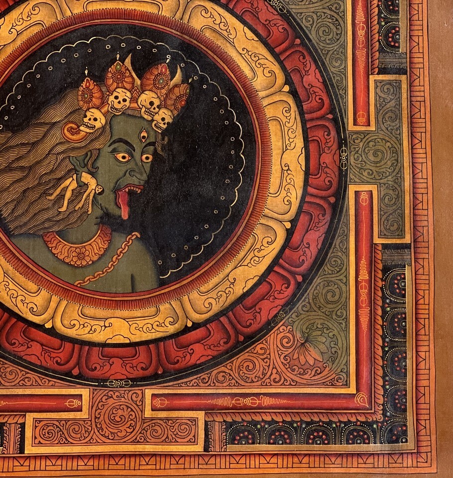 Bring home a powerful symbol of divine energy and protection with this hand-painted Sri Yantra Mahakali Mandala Thangka. Created in the traditional Newari style of Kathmandu Valley, this masterpiece combines spiritual depth with exquisite artistry, making it a meaningful treasure for both collectors and spiritual practitioners.