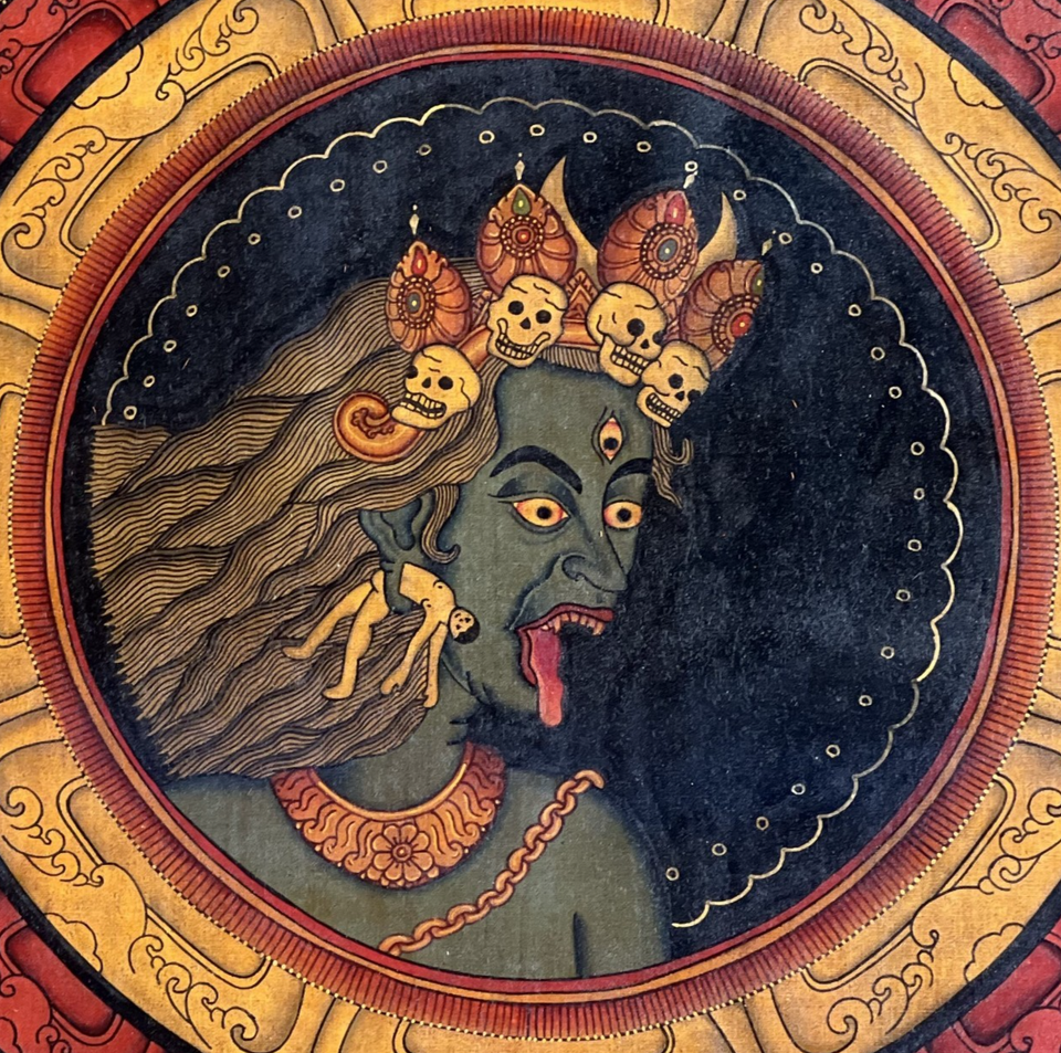 Featured at the heart of this painting is Goddess Mahakali, the fierce mother goddess who embodies courage and transformation. She is invoked for her power to destroy negativity, remove obstacles, and bless her devotees with protection and empowerment.