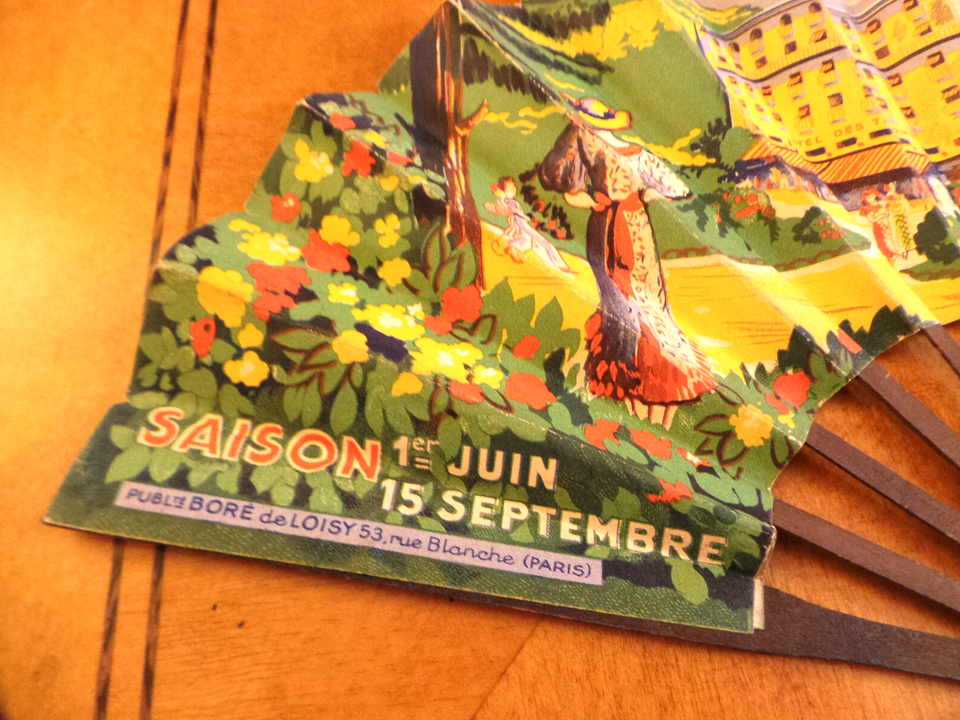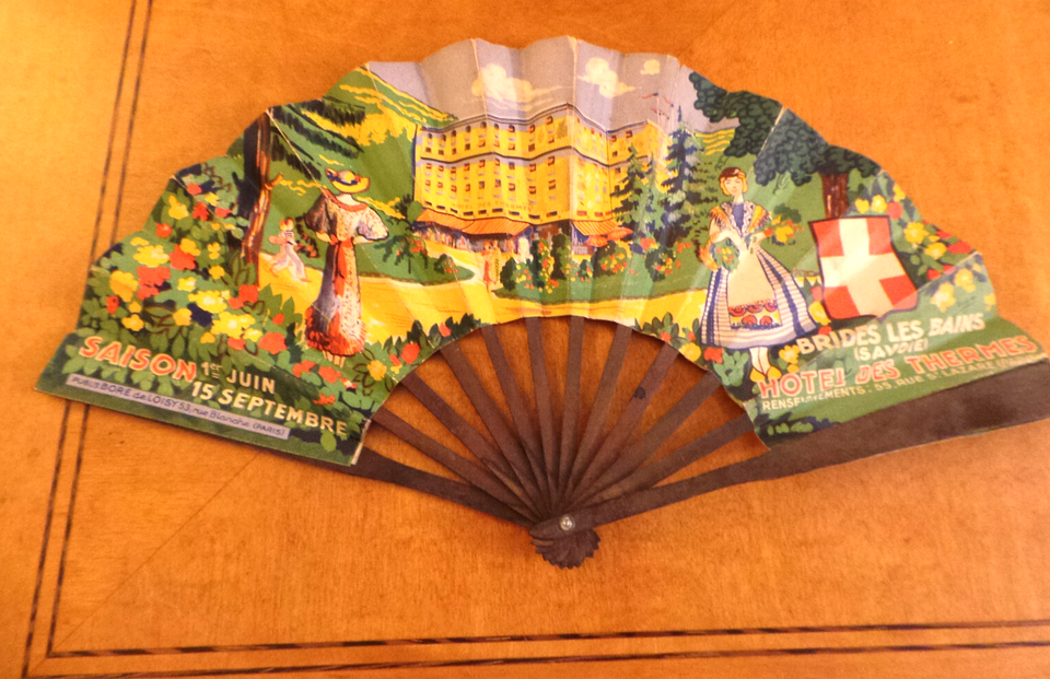 rare 2 sided French folding advertising fan "Brides les Bains, Hotel des Thermes. fabulous colorful fan of people, hotel etc. 1930.