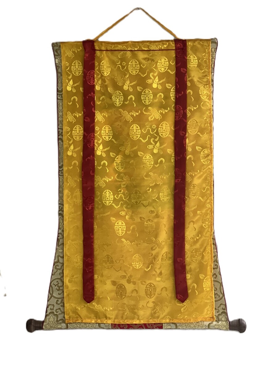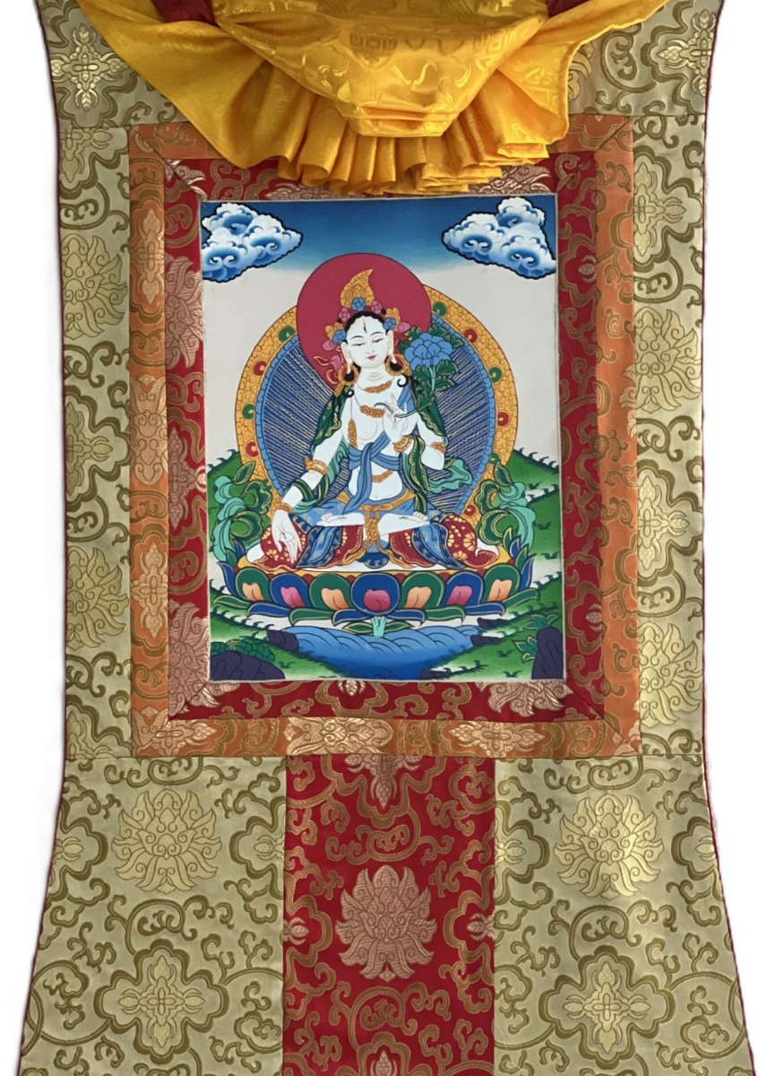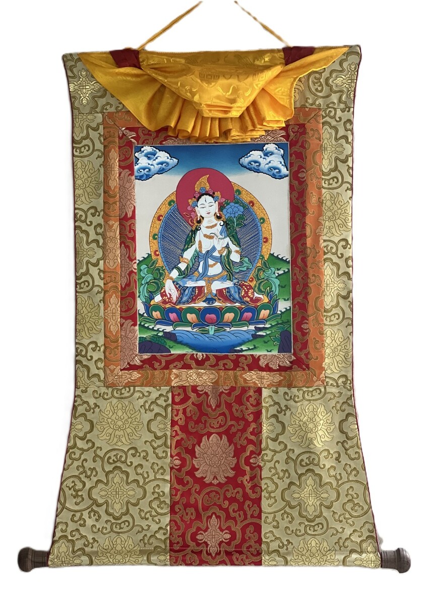 HAND-PAINTED WHITE TARA TIBETAN THANGKA BUDDHIST GODDESS ART WITH SILK BROCADE