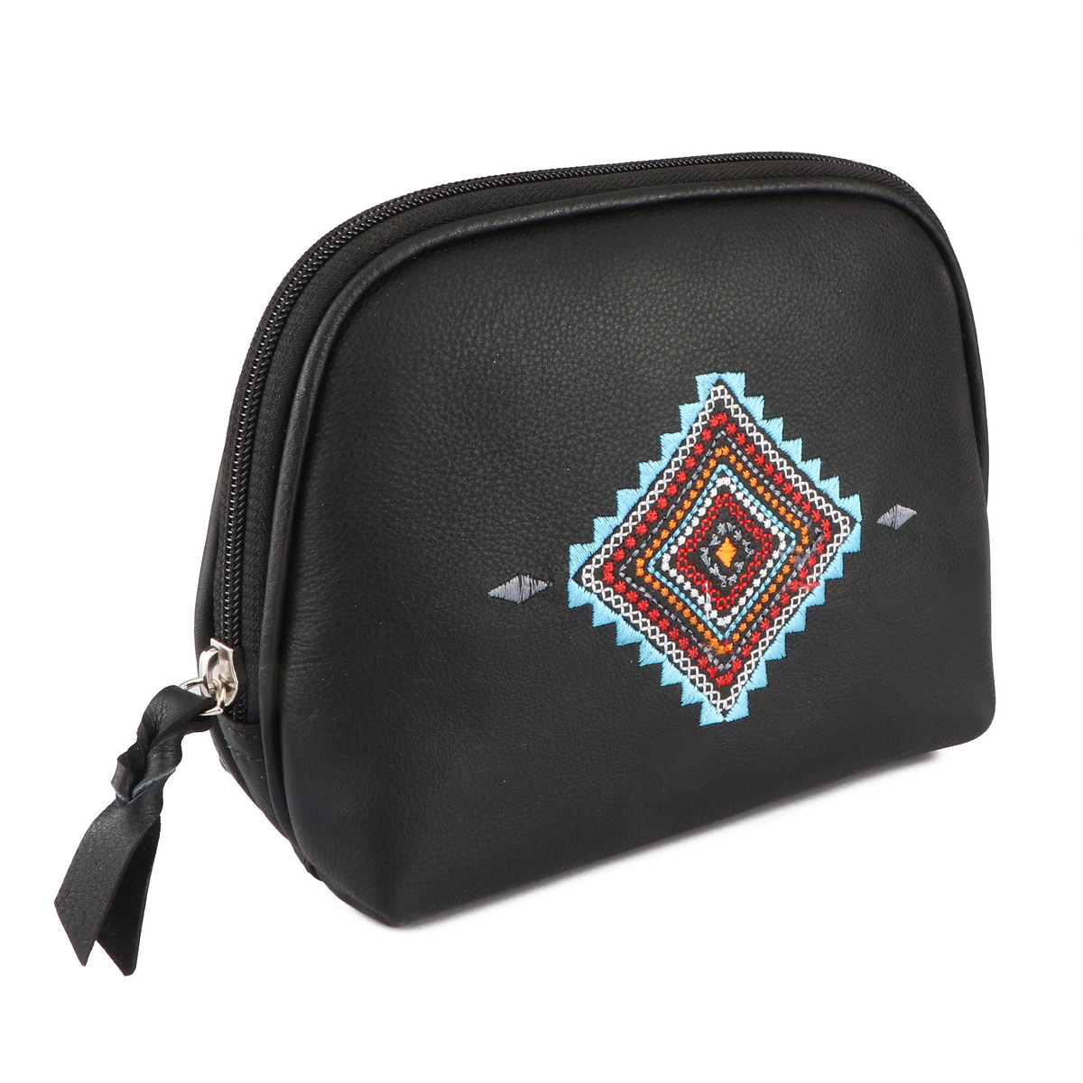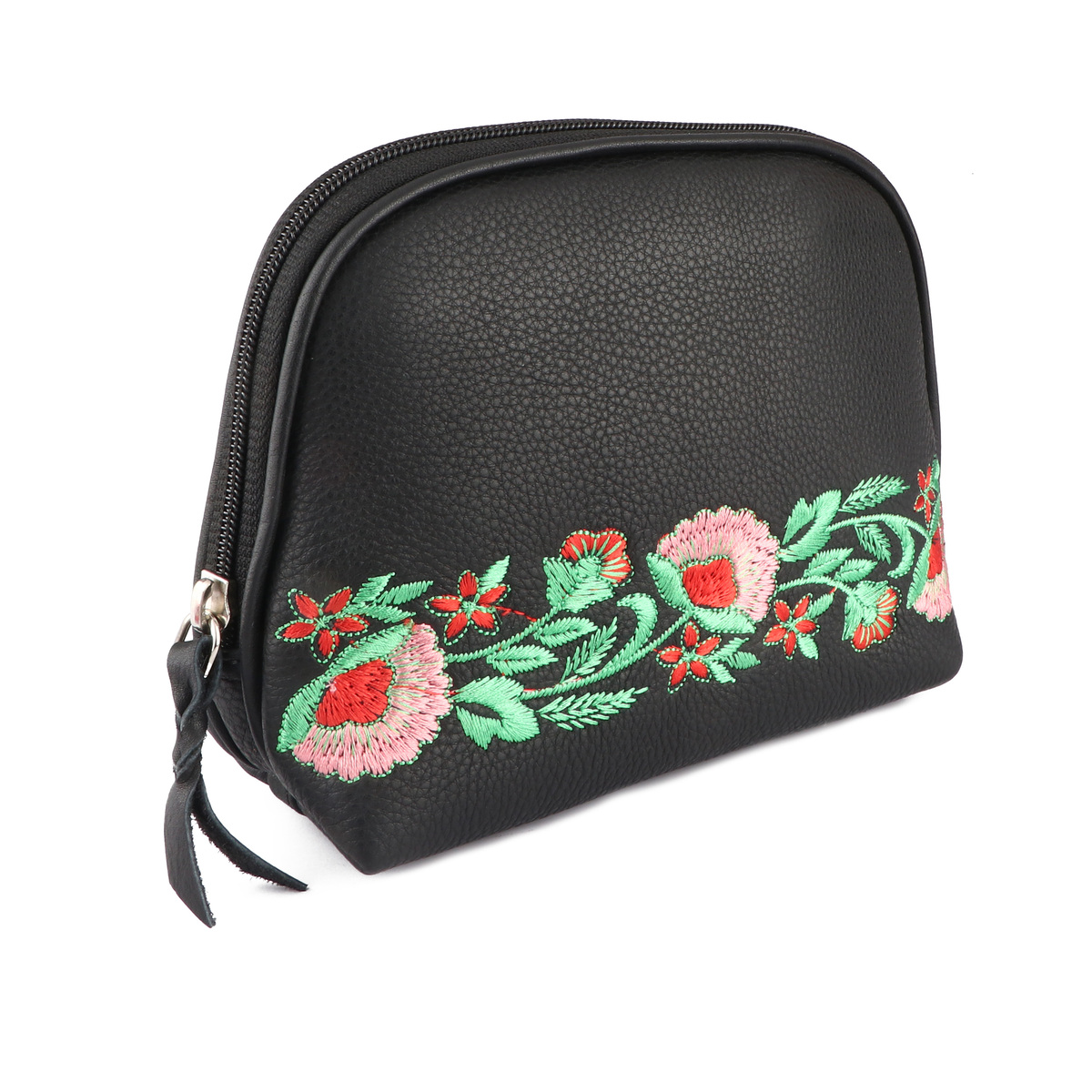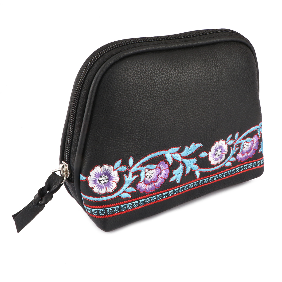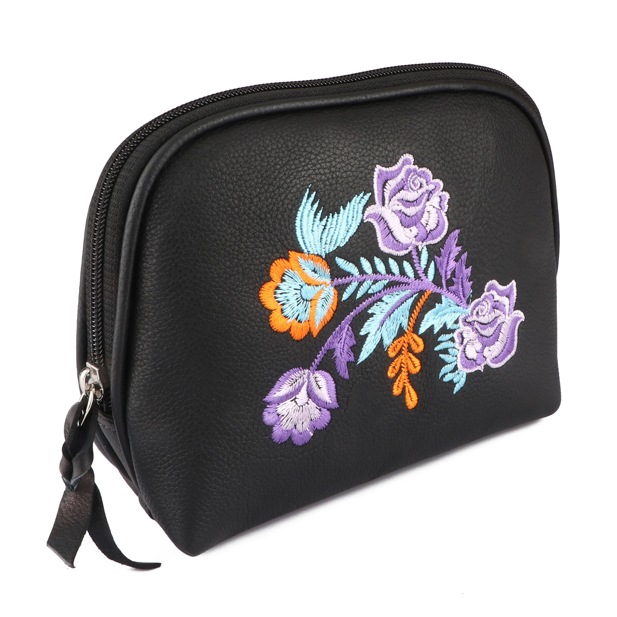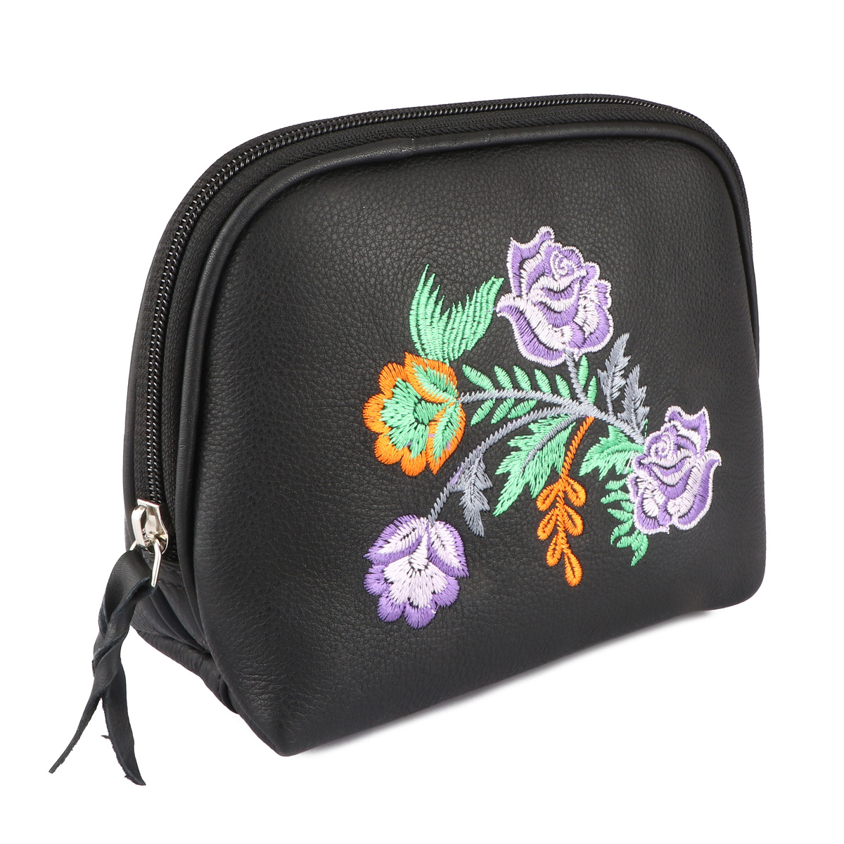 Challenger handcrafter cosmetic make-up bag made from soft, yet supple black leather. Beautifully accented with a unique embroidered design. Bag measures 7-1/2" long x 3" wide x 6" height, ensuring plenty of room for all essentials while being conveniently easy to carry. Available in pany patterns!