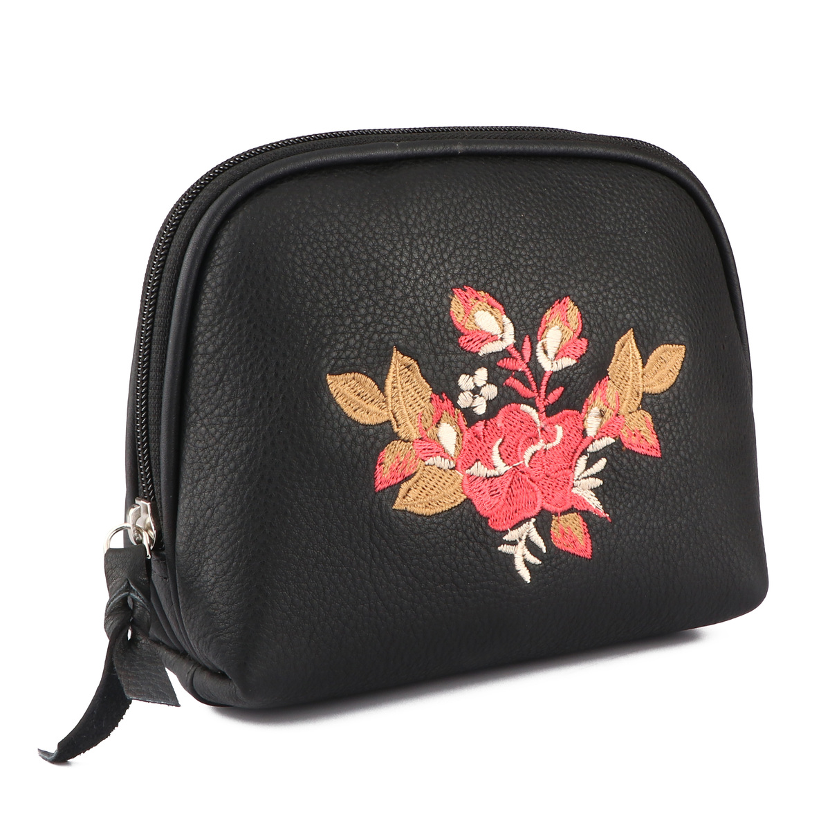 Women's Black Leather Floral Embroidered Zippered Makeup Cosmetic Bag 18Cosmetic