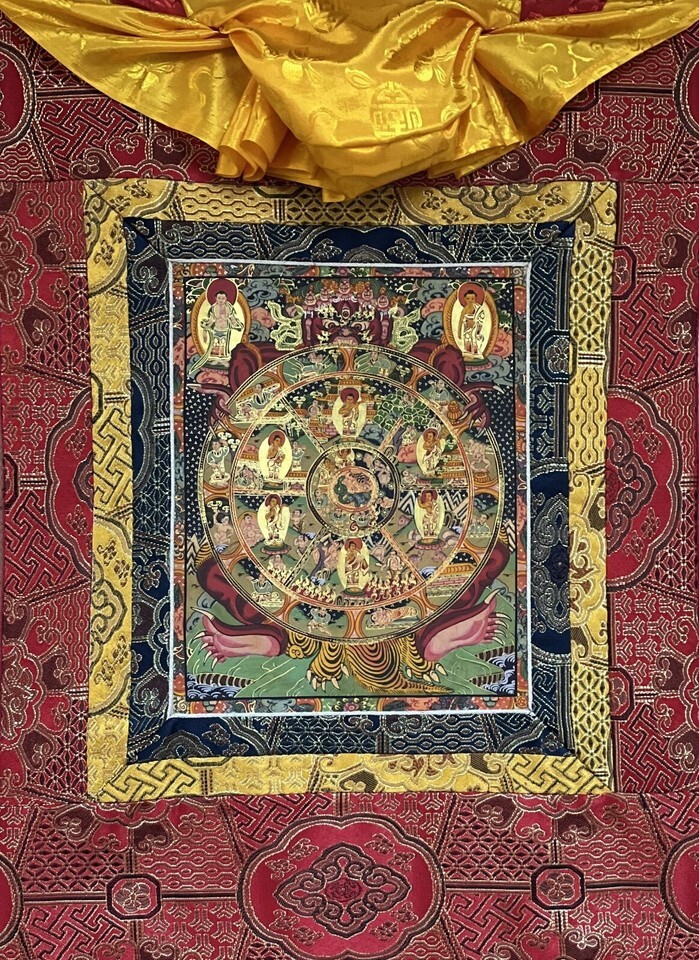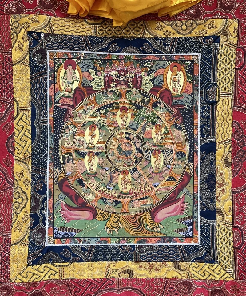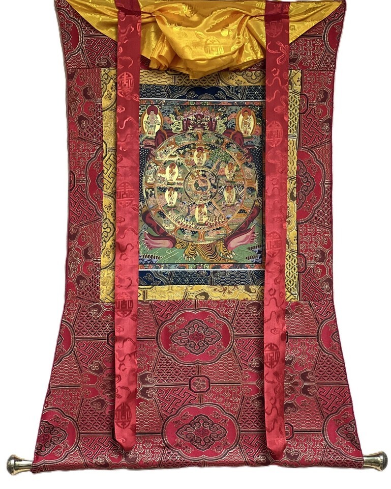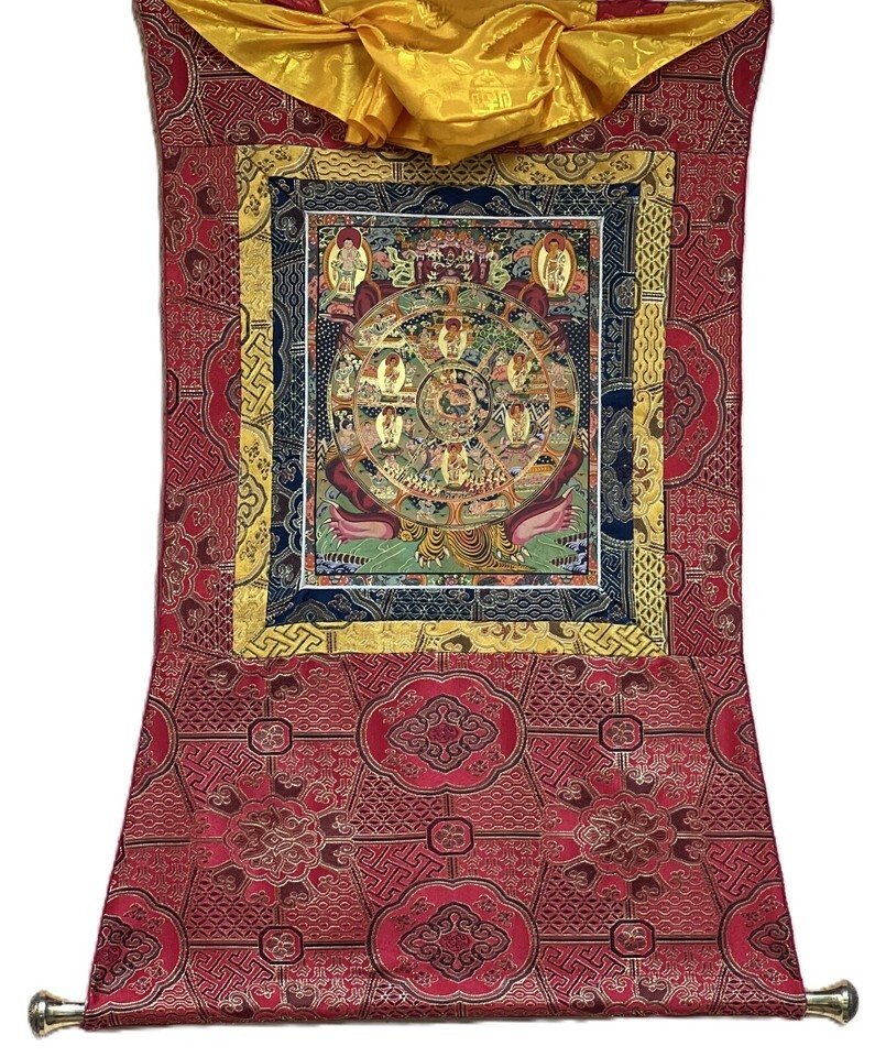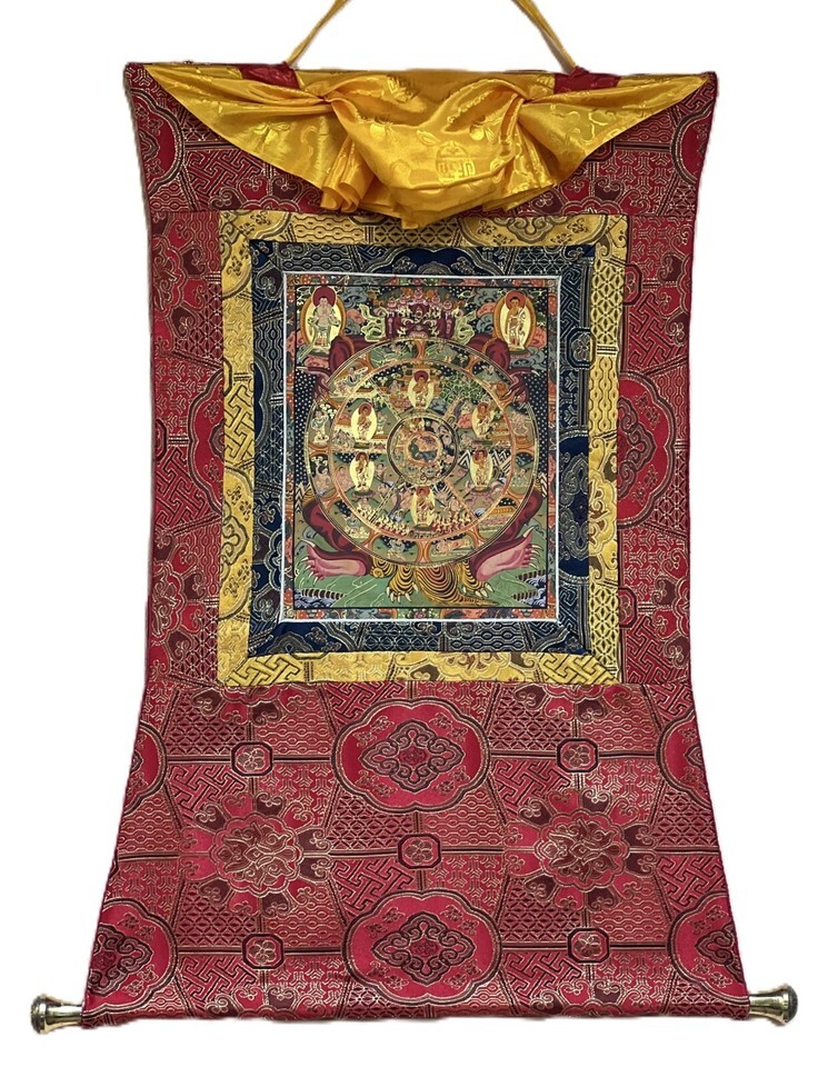 WHEEL OF LIFE BHAVACAKRA MANDALA TIBETAN THANGKA PAINTING HIGH SILK FRAMED