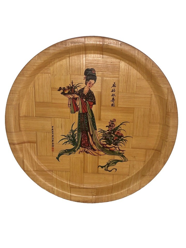 Vintage Handpainted Asian Geisha Girl Goddess 13” Round Woven Bamboo Tray