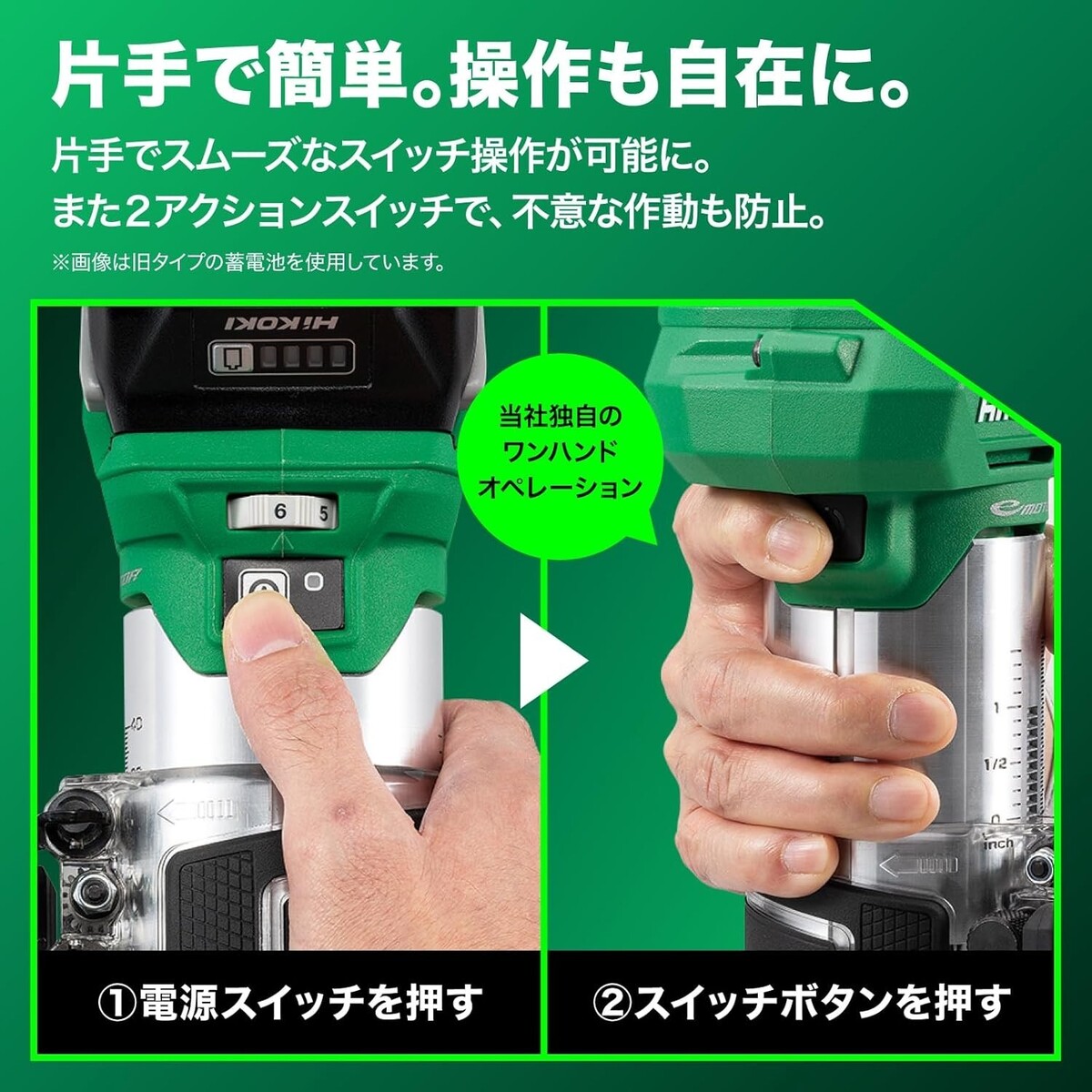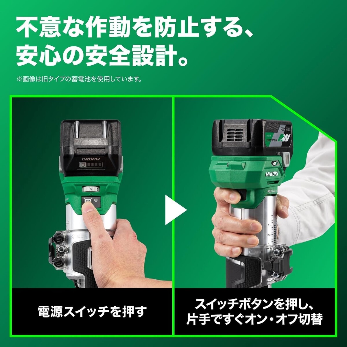 Instant ON/OFF with one hand. Our unique one-hand operation. The switch is positioned on the grip for smooth, single-handed operation. Additionally, the two-action switch prevents accidental activation.