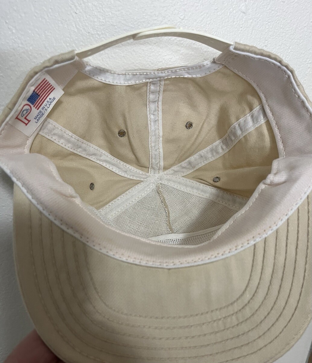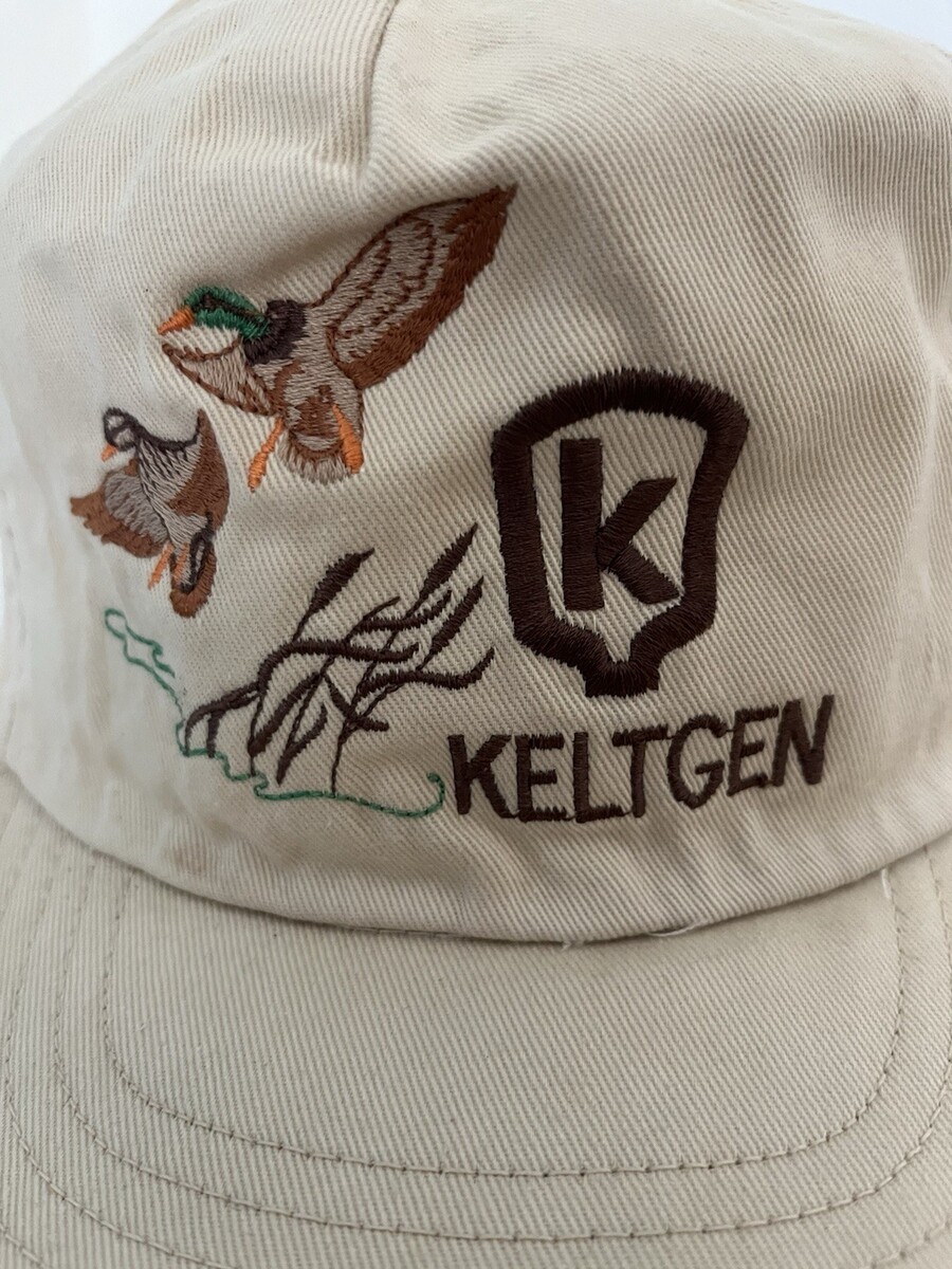 The Keltgen SnapBack Trucker Hat Cap is a vintage piece from the 1980s, featuring an embroidered wildlife scene of ducks. Made of durable canvas material, this beige cap is adjustable for a perfect fit. Proudly made in the USA, this original snapback hat exudes a casual look that is ideal for everyday wear. The unique design and high-quality construction make it a standout accessory for any vintage enthusiast.