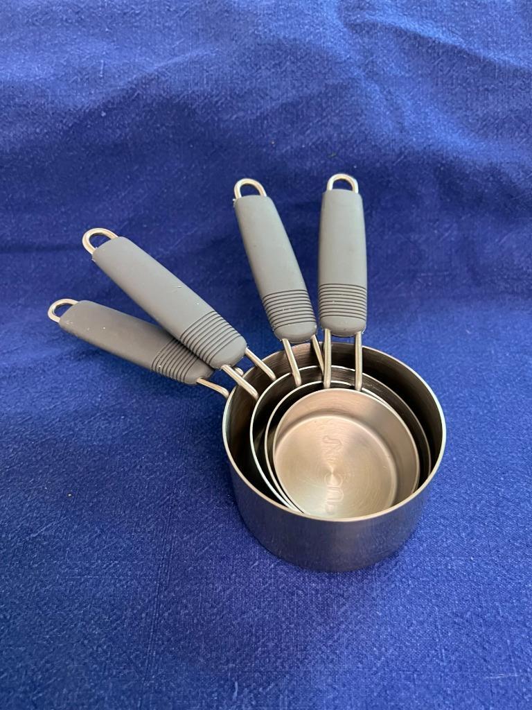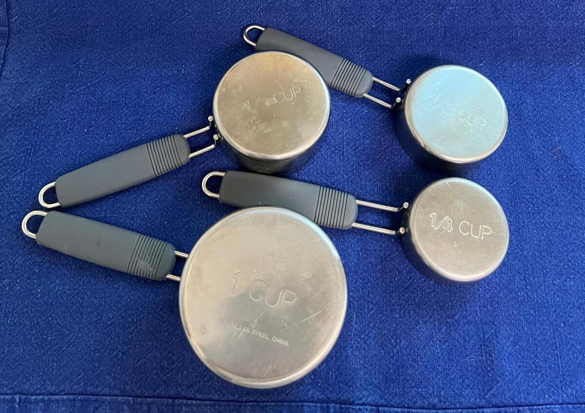 Set of 4 Stainless Measure Cups w Gray Silicone Handles 1 cup 1/2 1/3 1/4