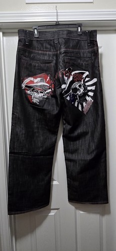 Vintage Avirex SONS OF MAYHEM Diabolically Dangerous! Black Baggy Jeans - Hip Hop / Skater - Men's Tag Size 38x34. Actual measurements: 39" waist, 32.5" inseam, 11" across leg opening.