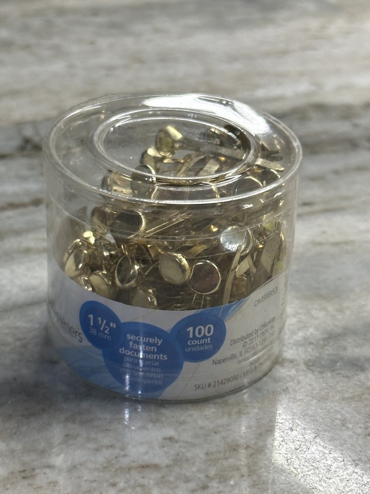 Enhance your office decor with these elegant brass-plated fasteners from OfficeMax. Measuring at 1 1/2\", this pack contains 100 count of desk accessories that are perfect for keeping your workspace organized. The fasteners are made with high-quality materials that ensure durability and longevity.