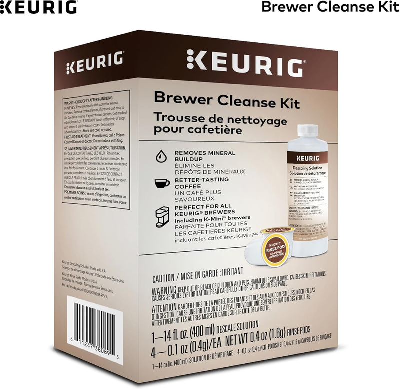 Cleaning your Coffee maker regularly is an important step to extend the life of your brewer and keep your beverages tasting their best. The Brewer Cleanse Kit is compatible with all Keurig Coffee makers and is the perfect cleaning solution for k-mini brewers. The Keurig Brewer Cleanse Kit includes 1 bottle of Keurig descaling solution and 4 Keurig rinse pods.
