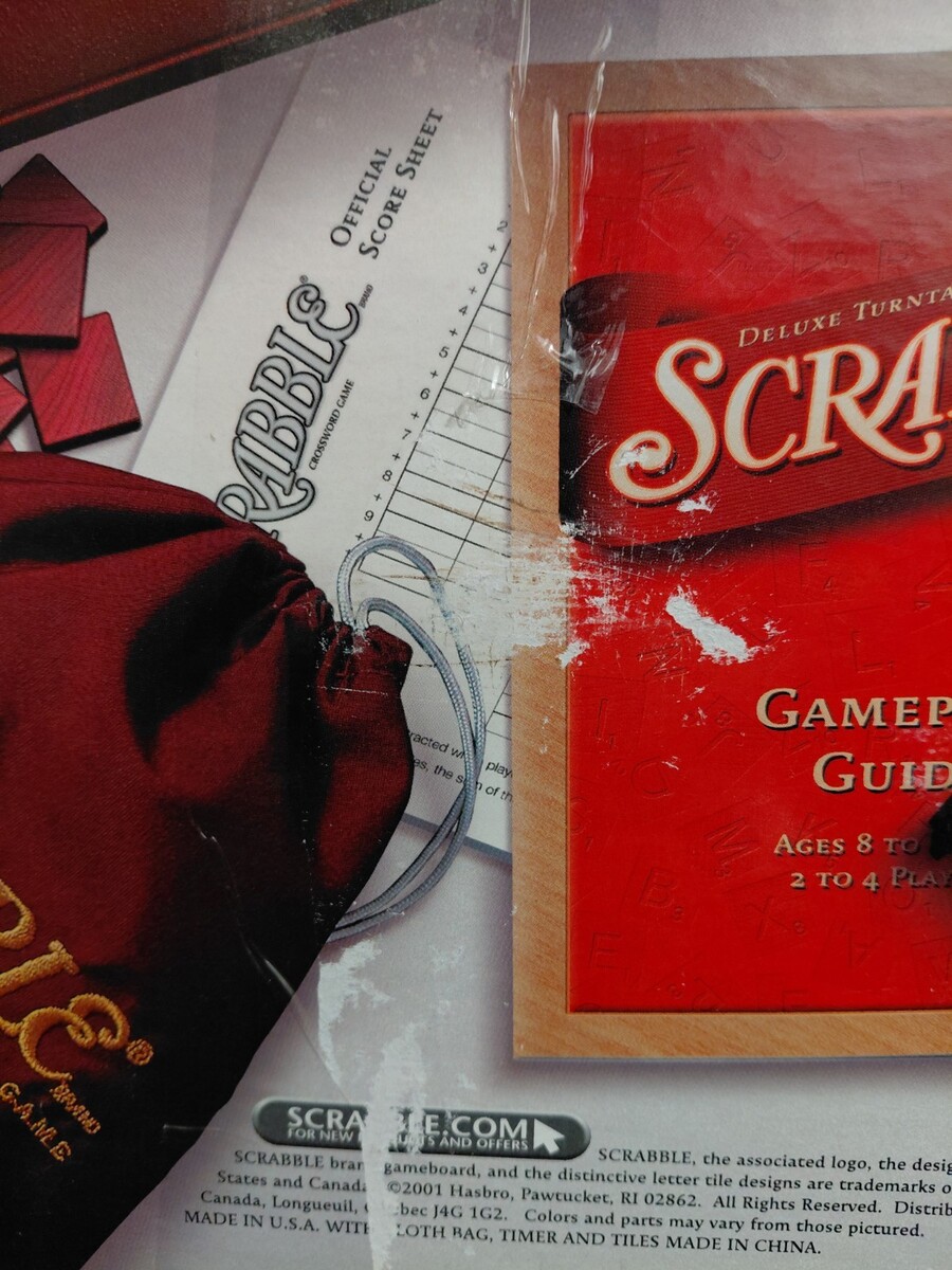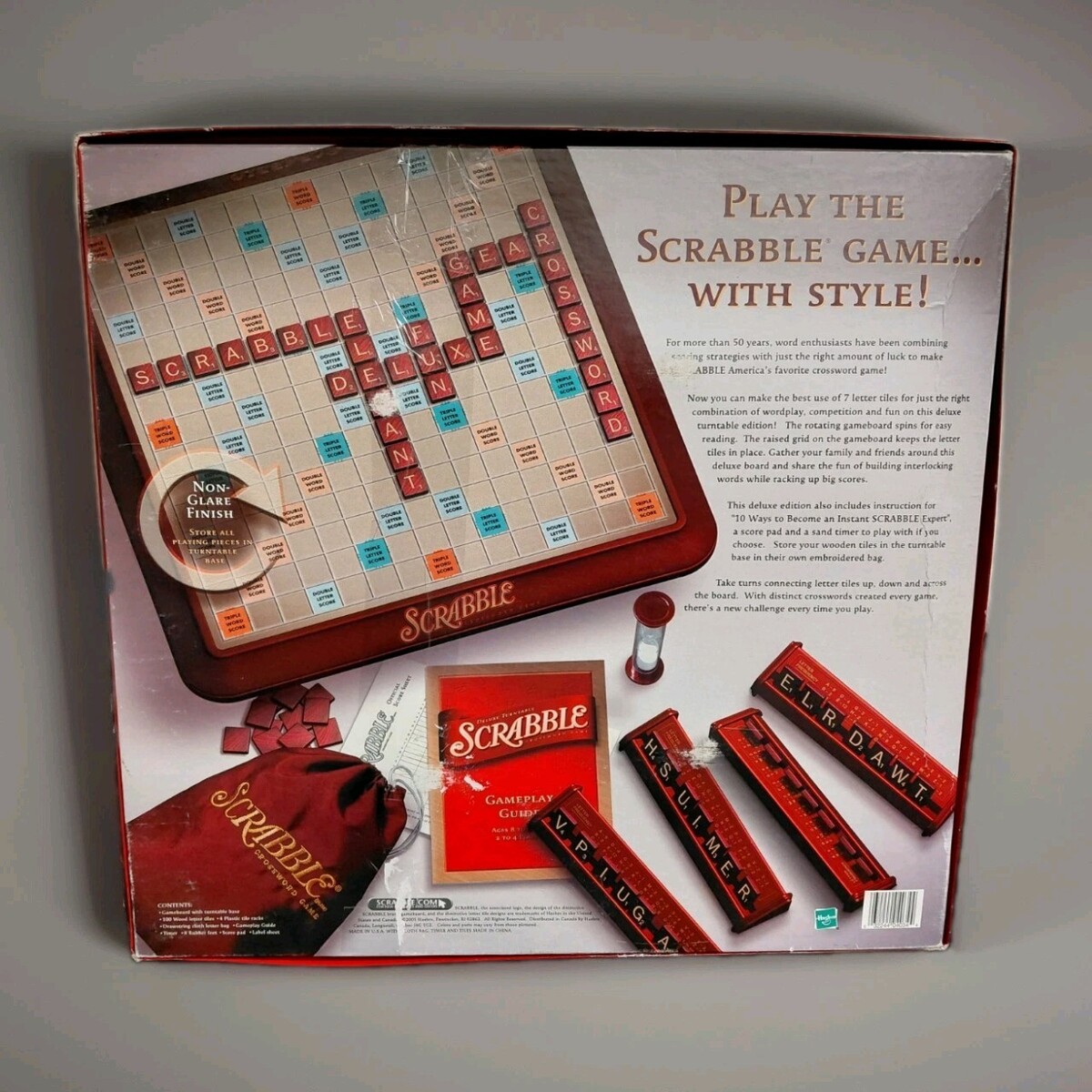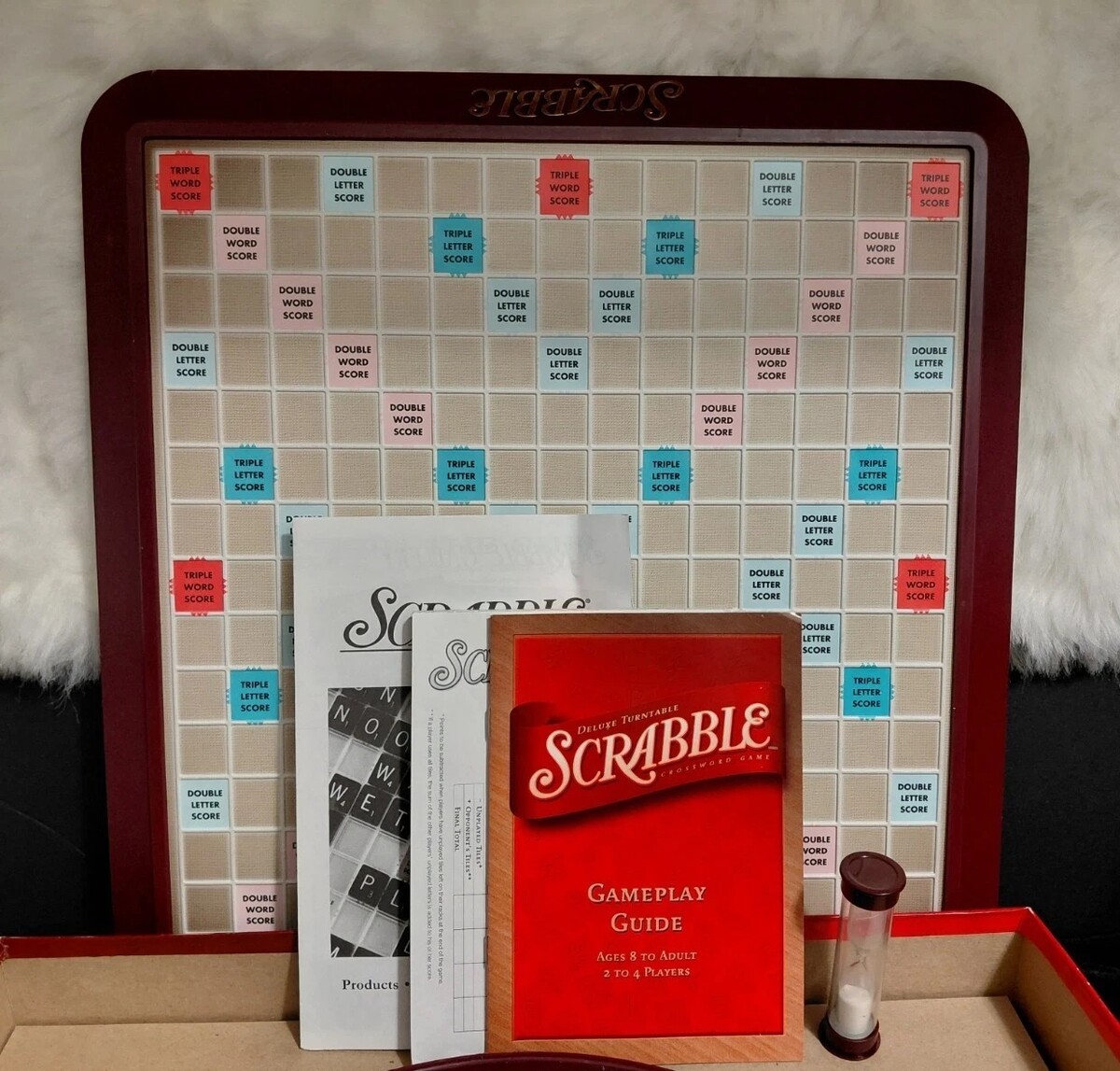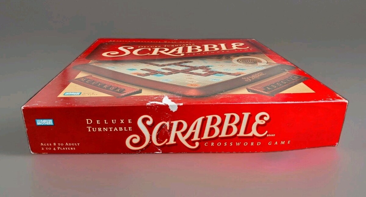 The Scrabble Deluxe Turntable Board Game by Parker Brothers is a complete game set for 2 players, featuring a giant game board with a turntable and lazy Susan for easy gameplay.