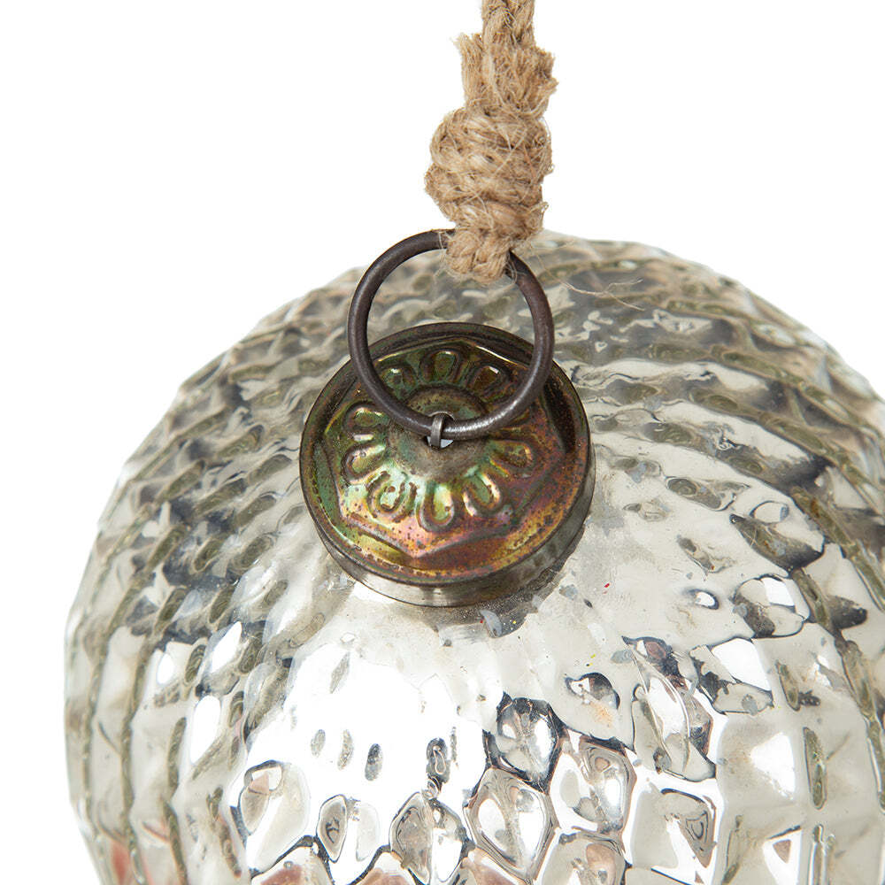 This hanging ornament boasts a sleek silver exterior and looks great on a Christmas tree.