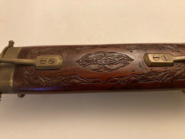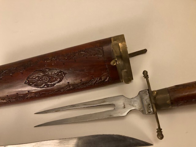Eastern Indian Carved Wooden Wood Brass Carving Set Fork Knife Vintage Very good over all. Please refer to images.