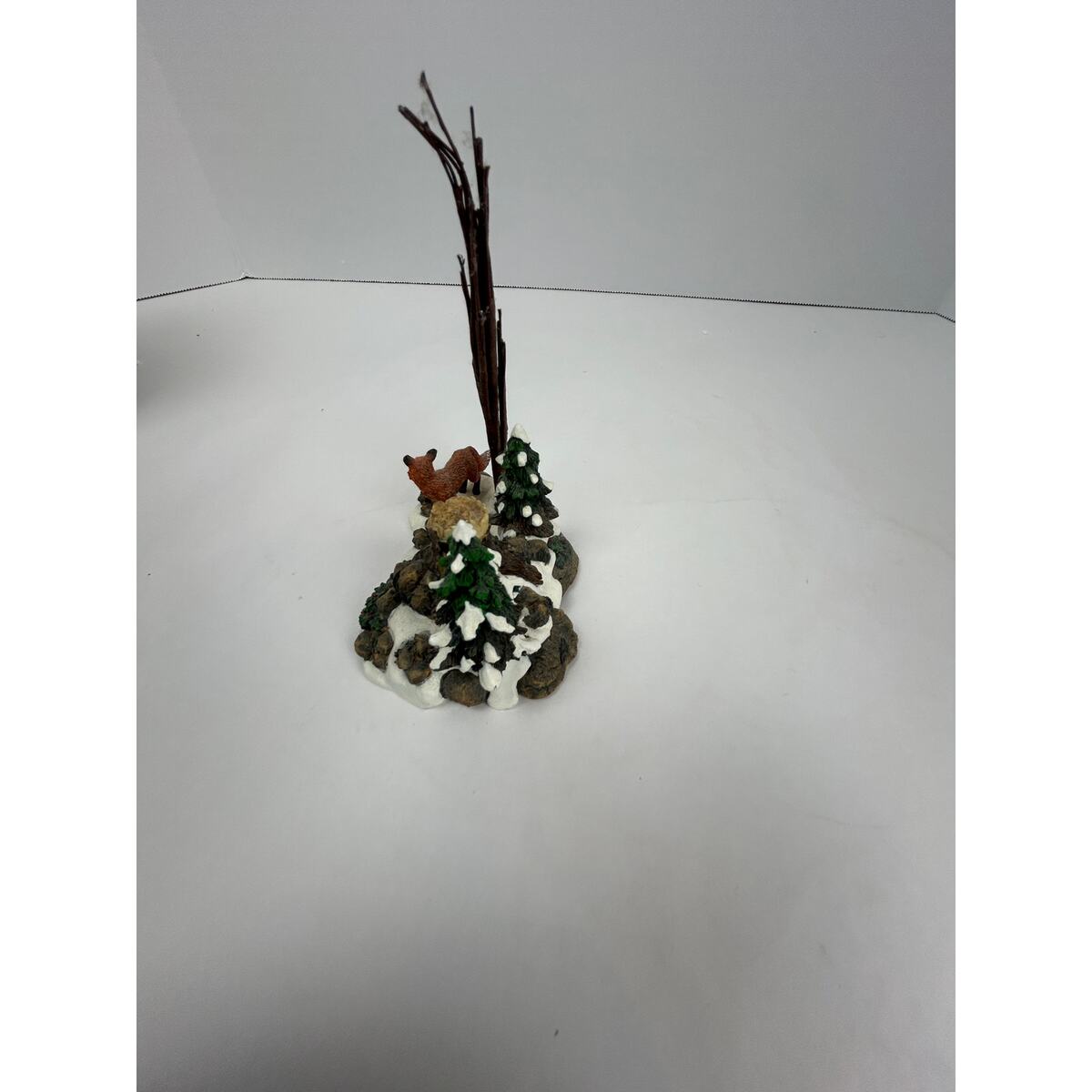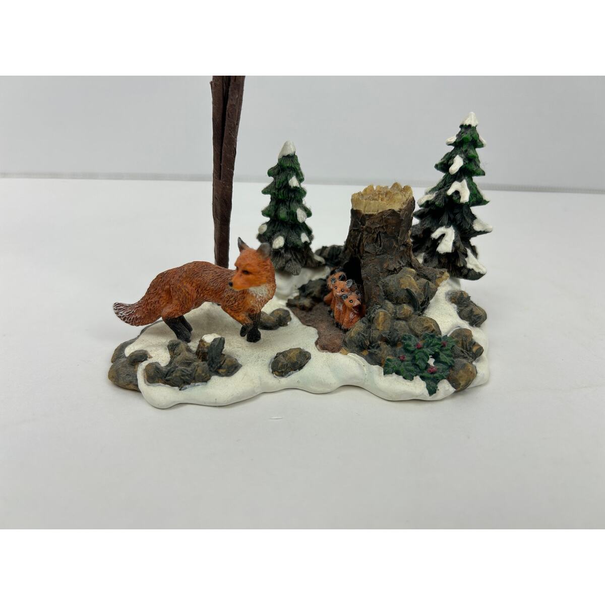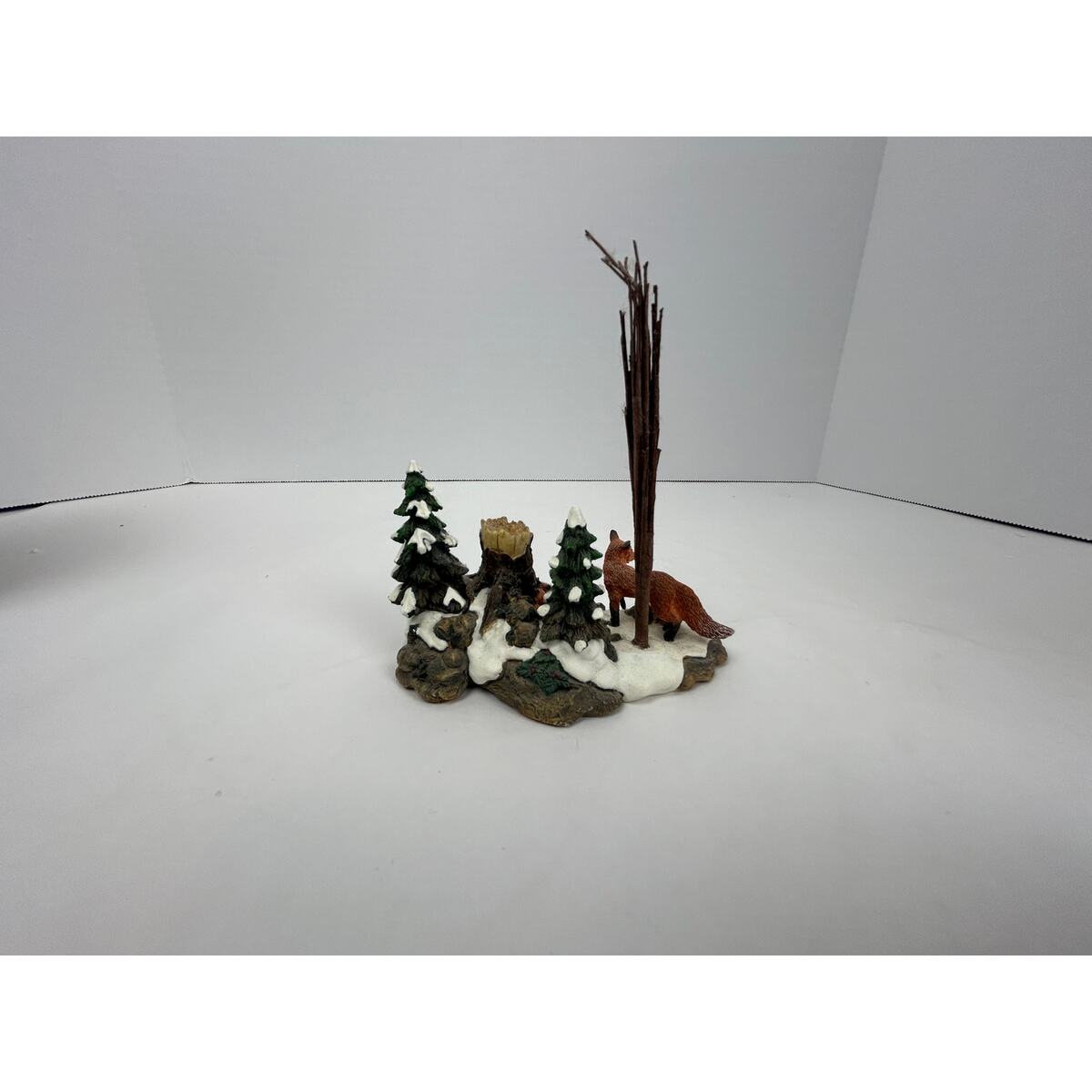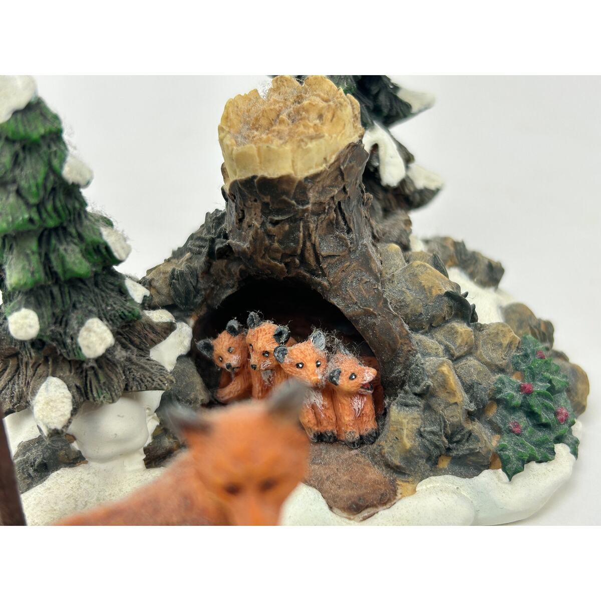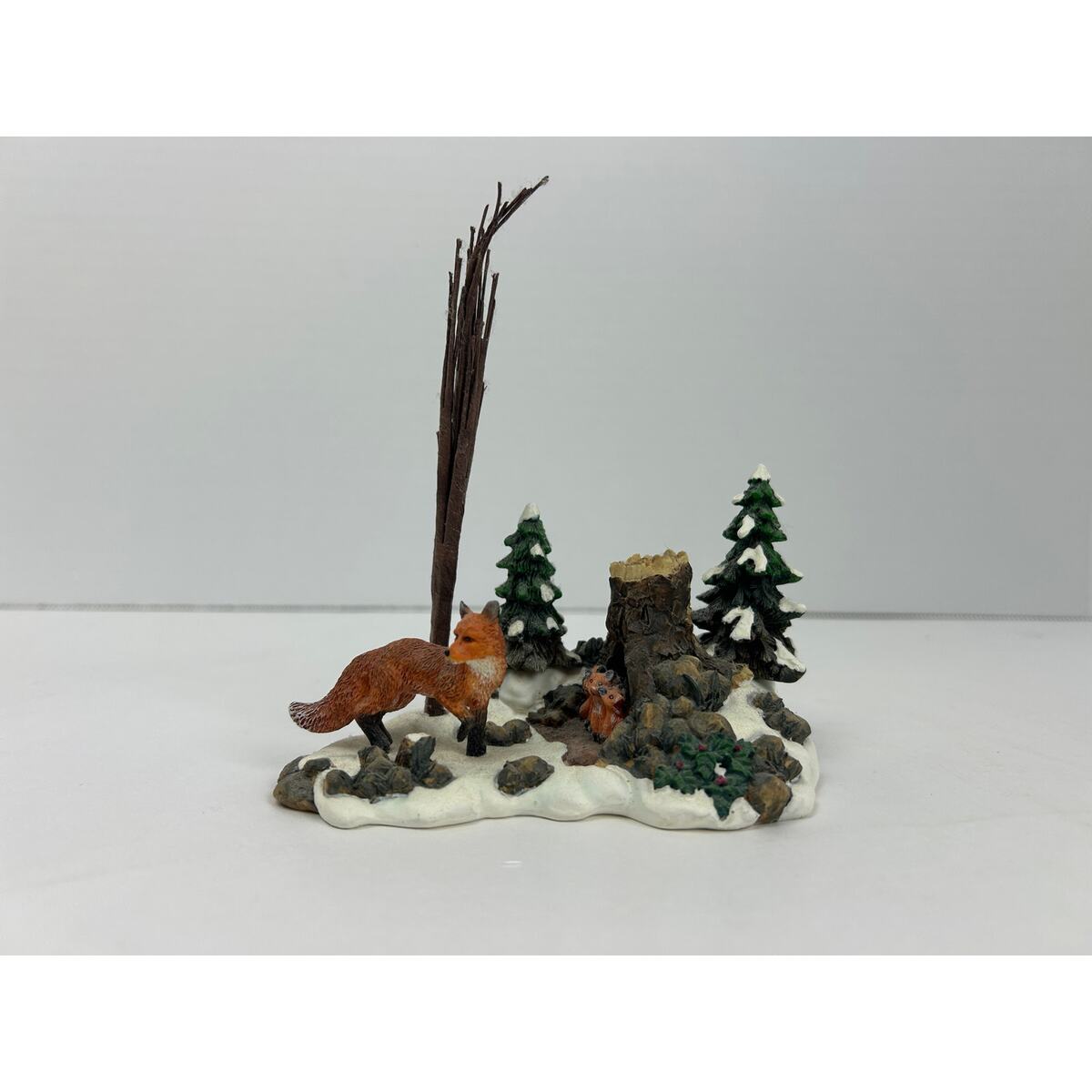 ? Hand painted resin and porcelain woodland fox family in winter setting