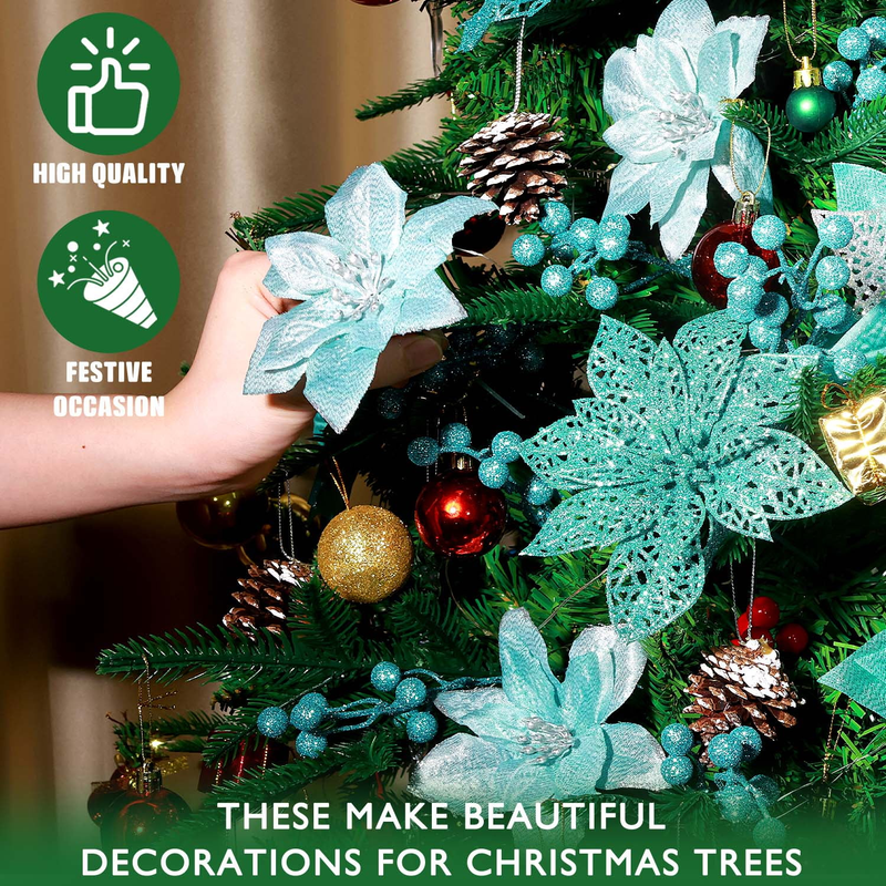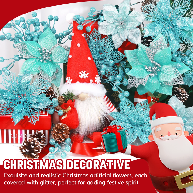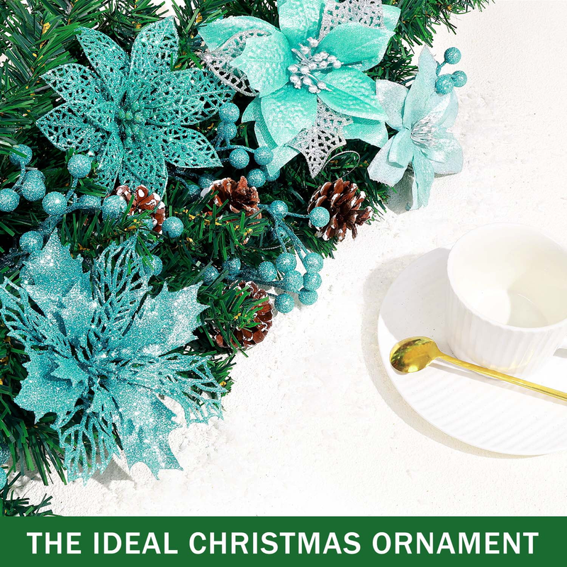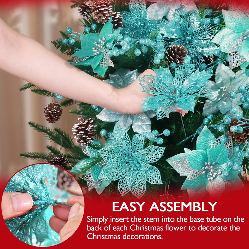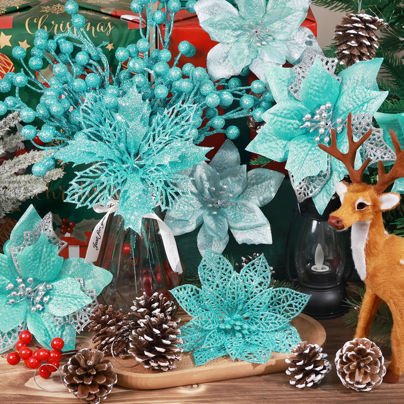 ?PACKAGE CONTENTS - Includes 16 red poinsettia artificial flowers, 20 glitter berry stems, 20 pinecones PREMIUM MATERIALS - Made of high-quality PVC and foam with glitter coating for a festive look EASY DECORATION - Insert stakes into poinsettia ornaments for effortless Christmas flowers decoration VERSATILE USE - Perfect for Christmas trees decoration set, weddings, birthdays, and more GLITTER NOTICE - Some glitter may drop during transit; open box outdoors for convenience
