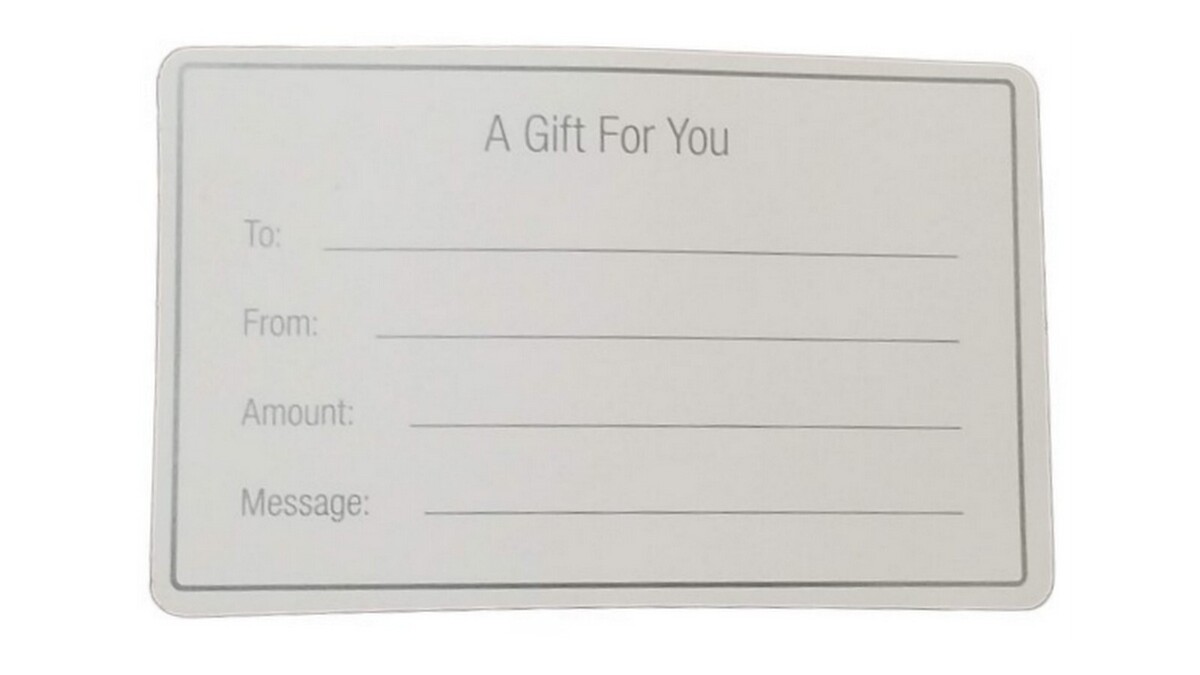 Envelope contains a Printed Gift for You Card where you can list "To," "From", the amount for the gift card a Message.