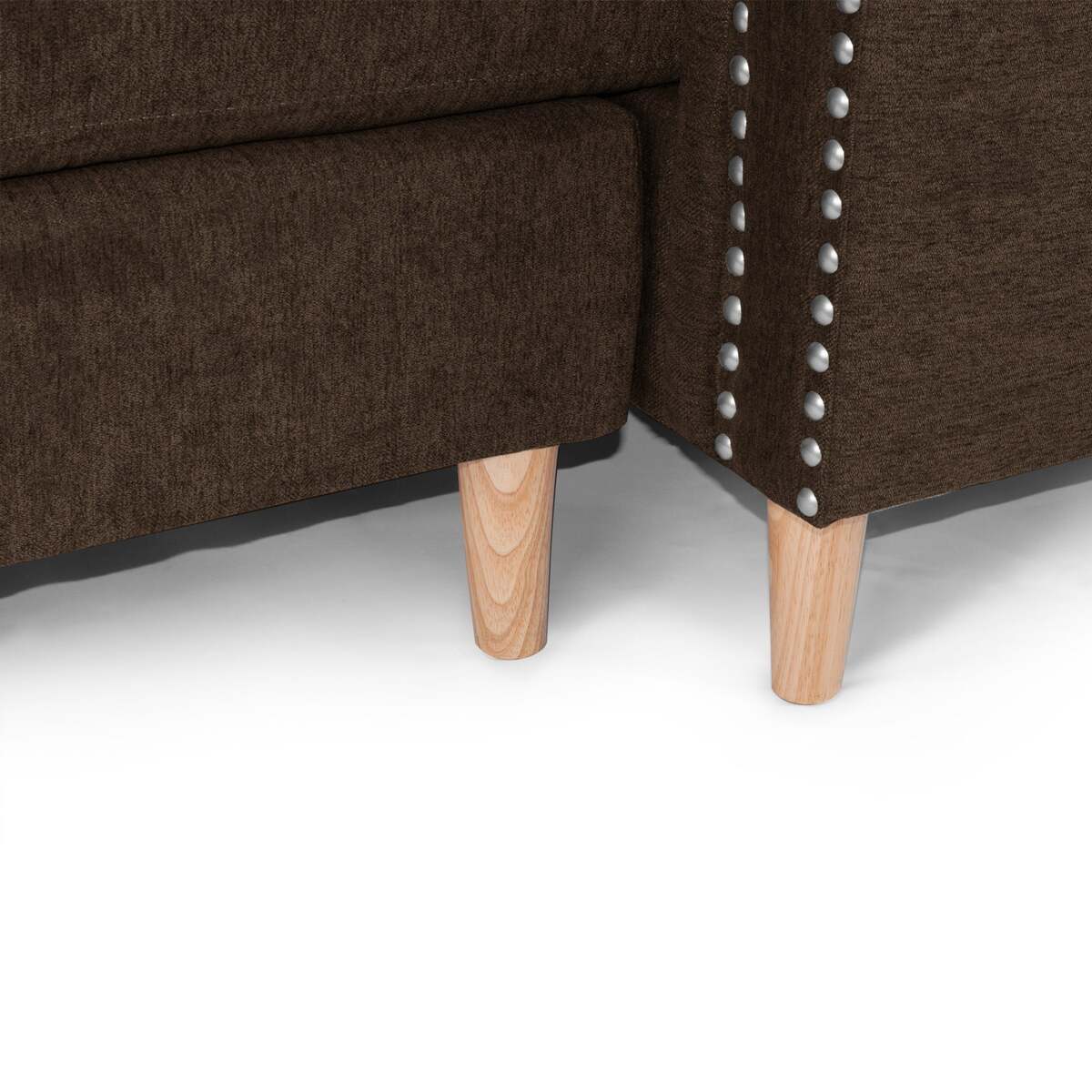 Nailhead trim along the rolled arms adds a decorative touch that enhances the tailored look of the piece.