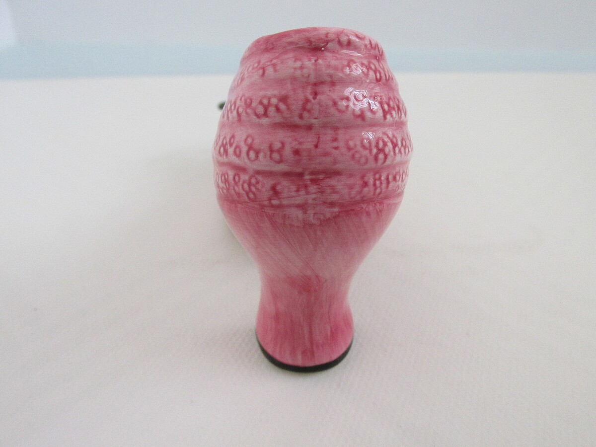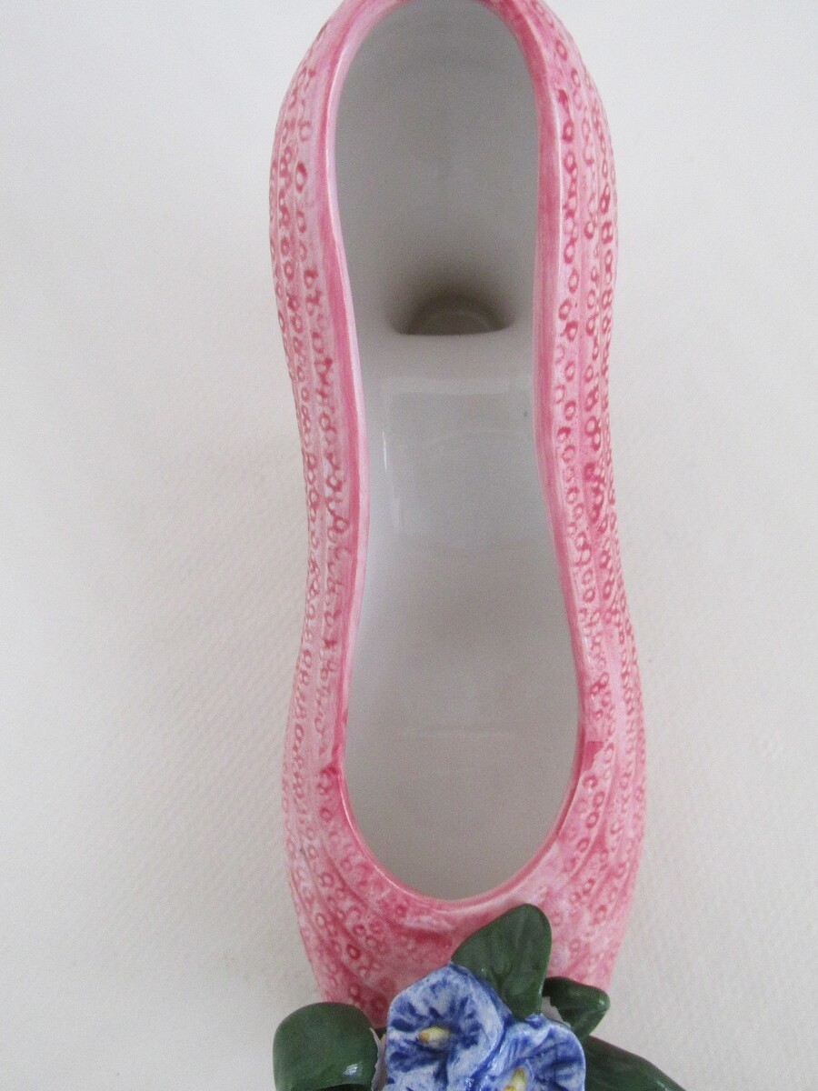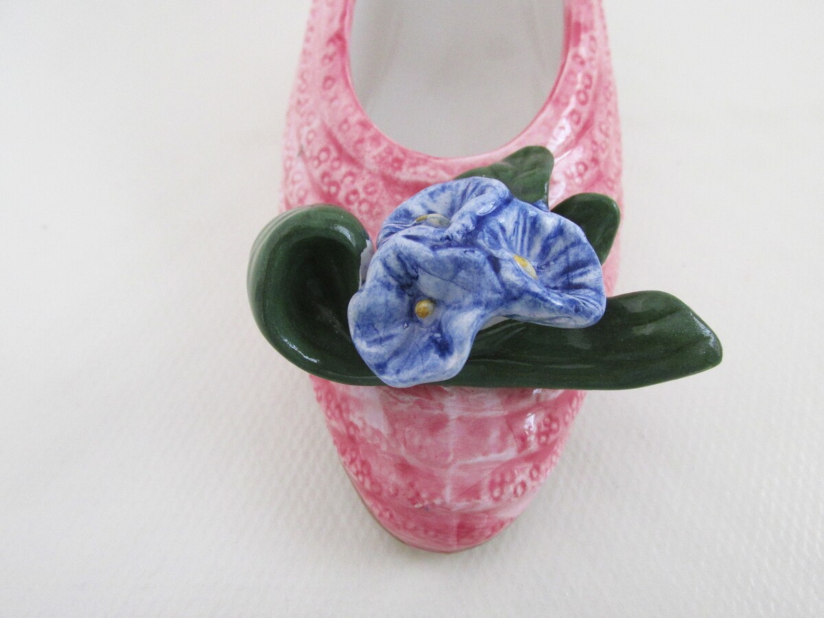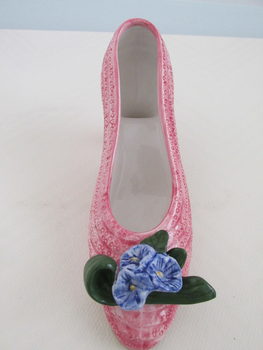 Description: Up for sale is a Seymour Mann (with mark) collectible hand painted ceramic shoe. This figurine is hand painted with a raised flower leaf in blue, white, green. It has a pink white base color. The overall height is 3.00", the width (at the widest point) 2.00", and the length (at the longest point) 6.00". This figurine is in perfect condition. It has no cracks, or chips and never has needed repair.