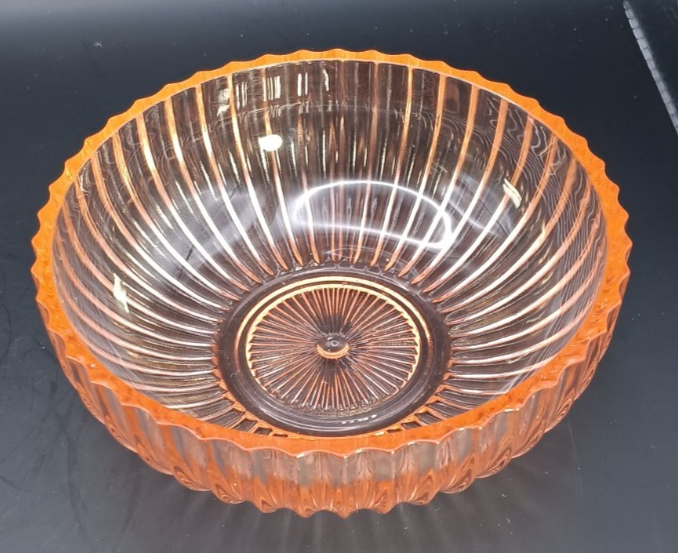 This product is a vintage Queen Mary pink bowl with a matching underplate, made of depression glass by Anchor Hocking in America. The round bowl features a glossy finish and is part of the Queen Mary product line from the early 20th century. This original set includes a beautiful pink bowl with a vintage pattern, perfect for collectors or those looking to add a touch of elegance to their home decor.