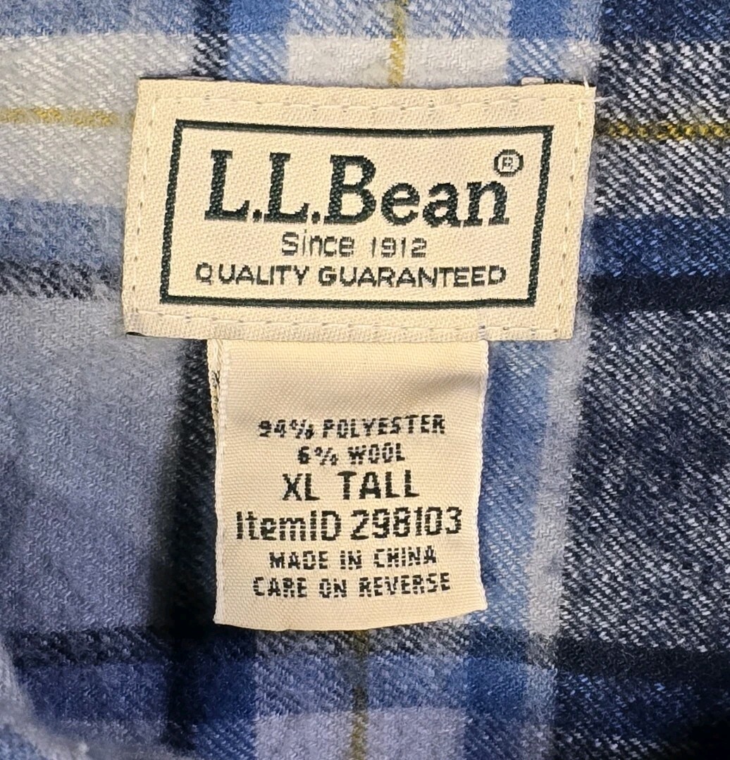 LL BEAN Shirt Mens XL Tall Katahdin Performance Flannel Wool Blend Blue Plaid