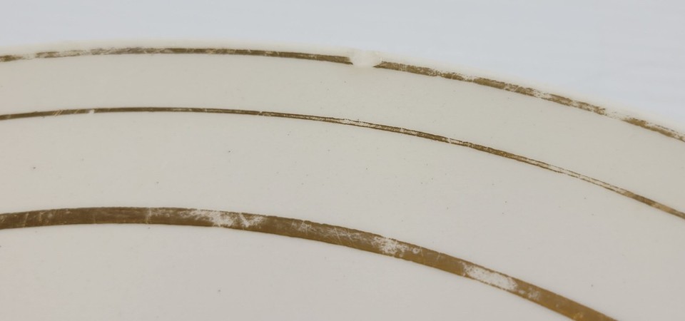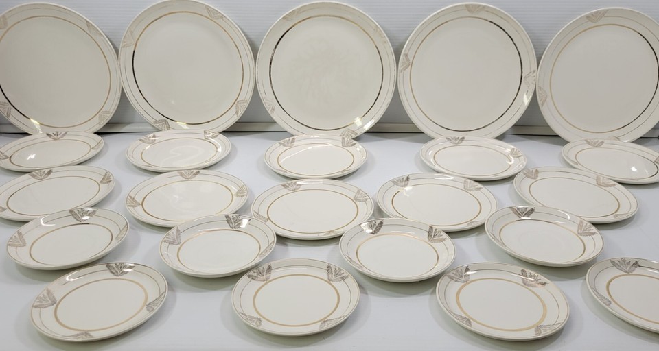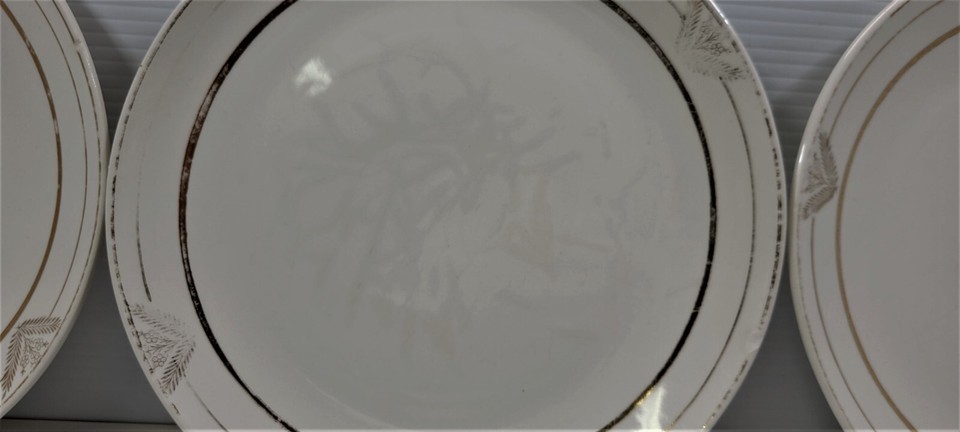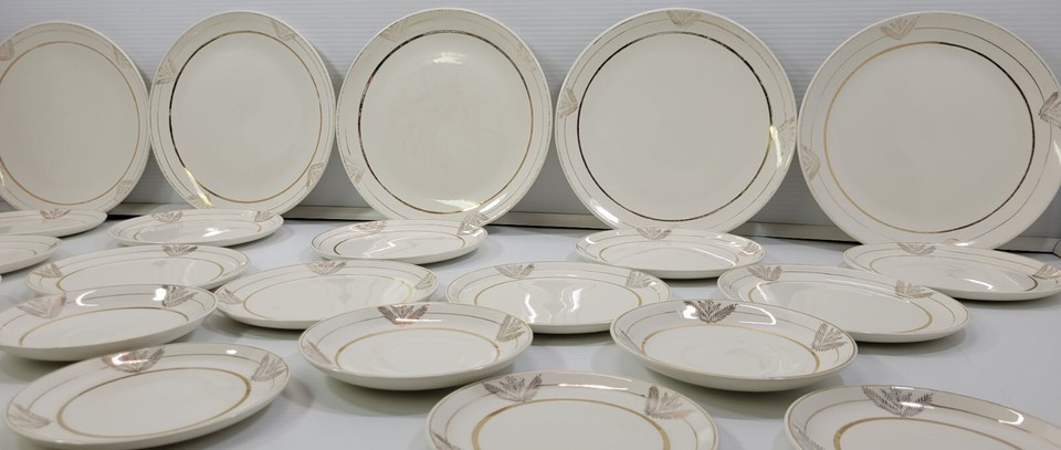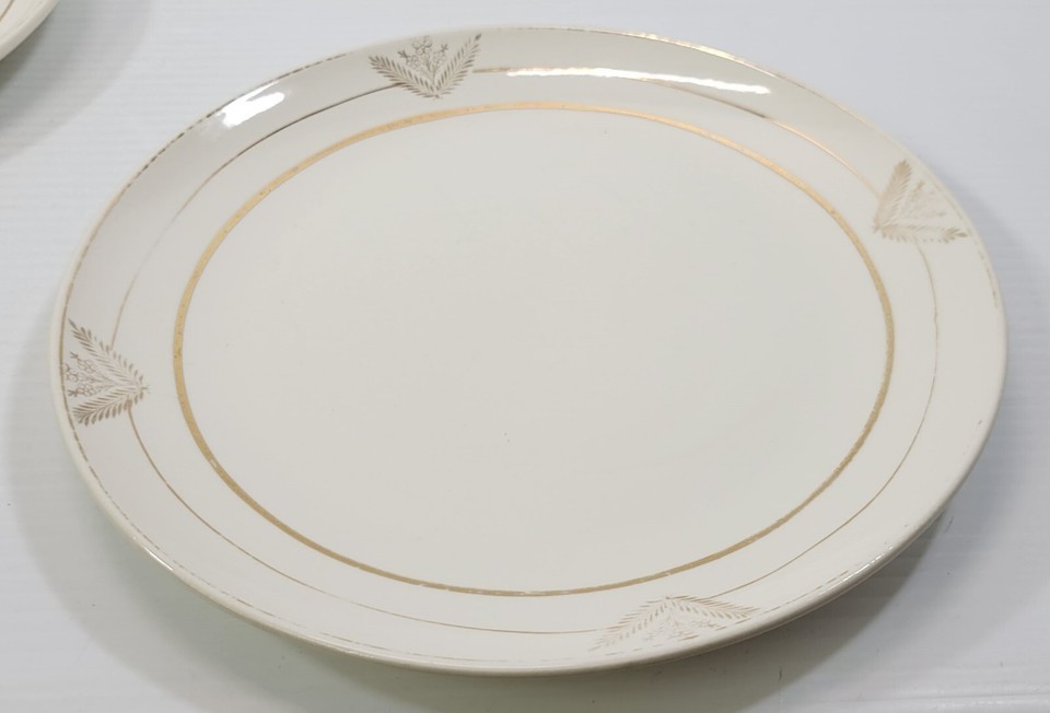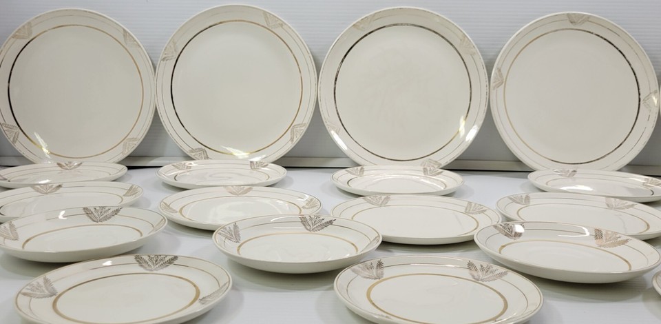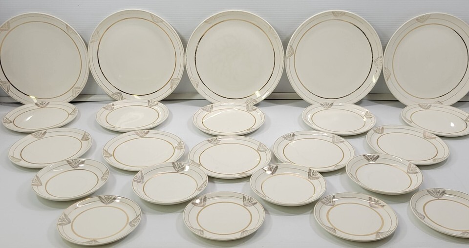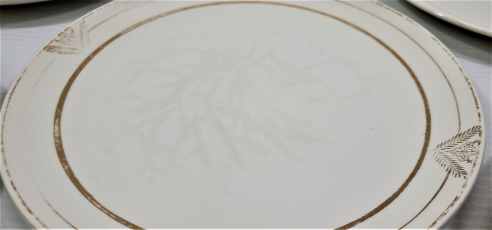 Lot is incomplete pieces of dinnerware set. All are in vintage used condition with signs of age, use and storage including some fading, scratches, and possible edge chips/scrapes. Usage is more evident on the large dinner plates. One dinner plate has visible crazing while all other pieces may have less visible slight crazing.